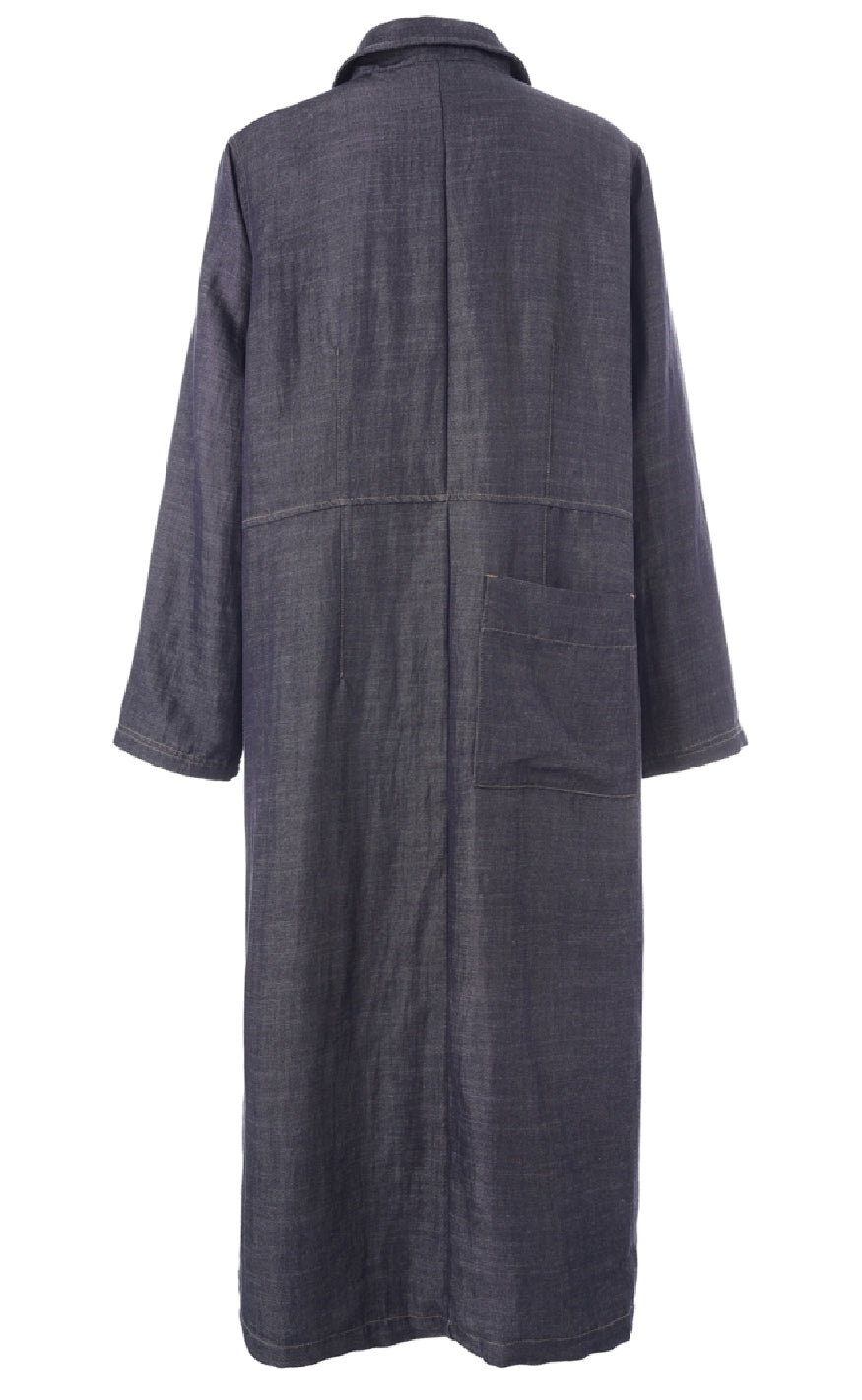 Kjolen har lange ærmer, krave, tre knapper foran og store påsyede lommer.