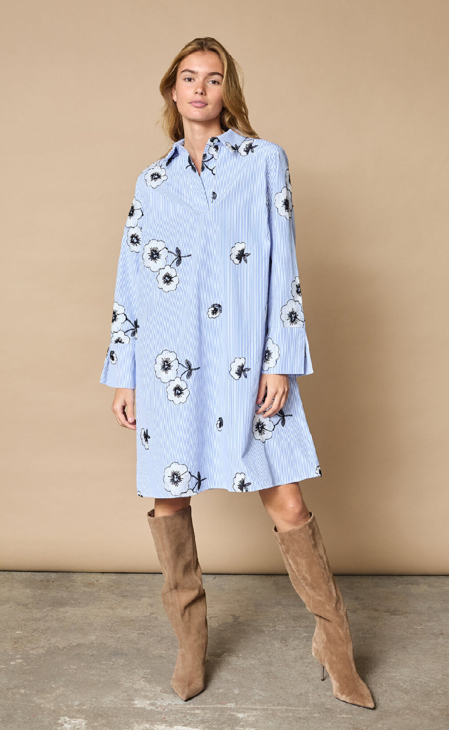 Stribet kjole fra Love & Divine i lyseblå med hvide striber og sort blomsterprint.