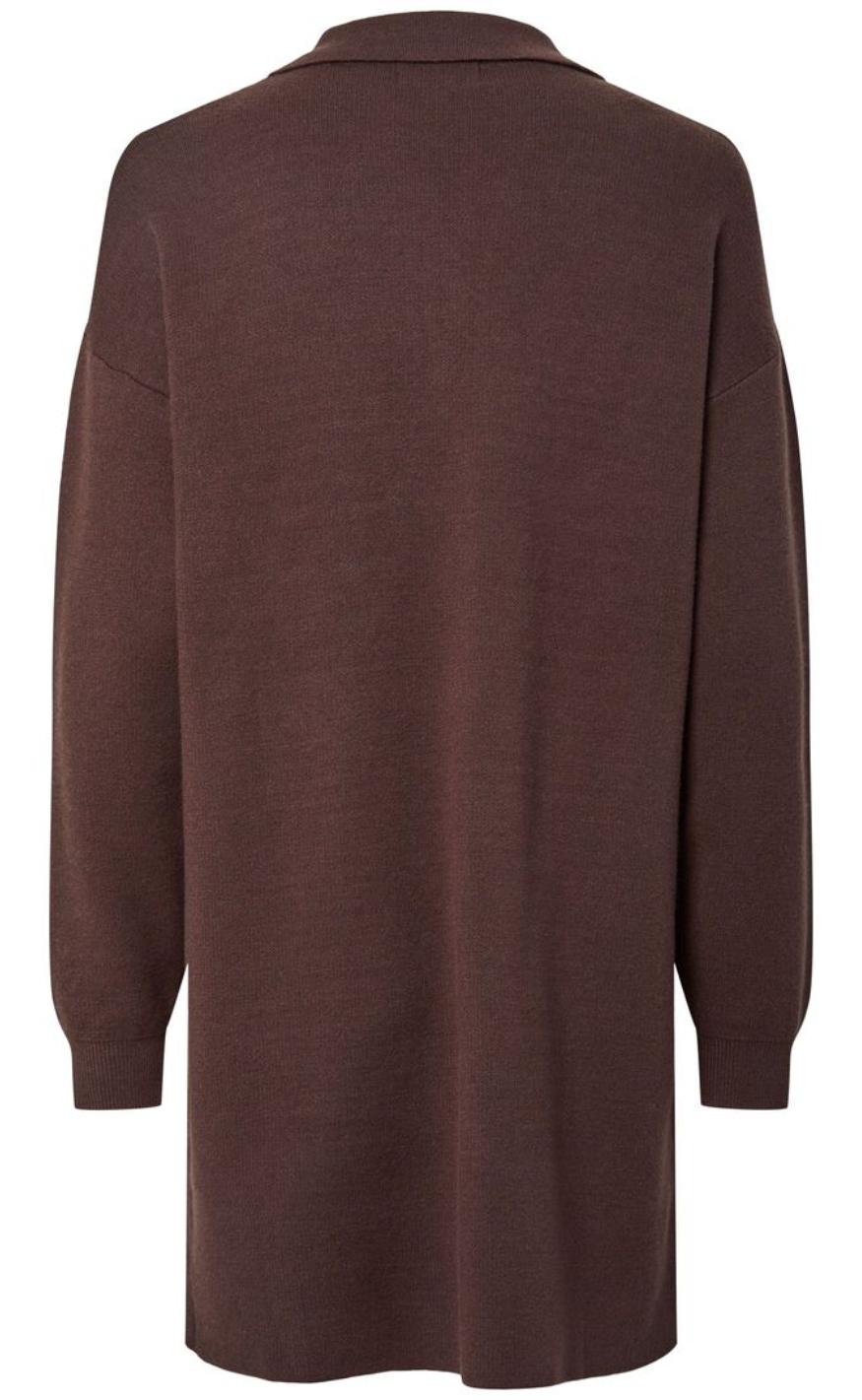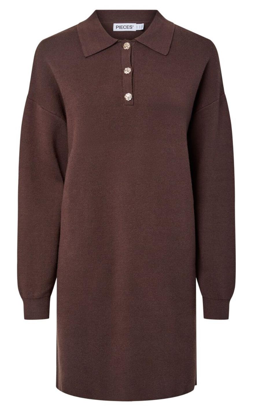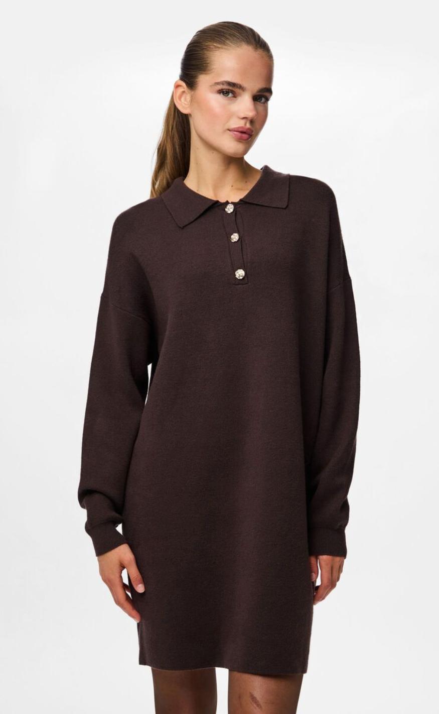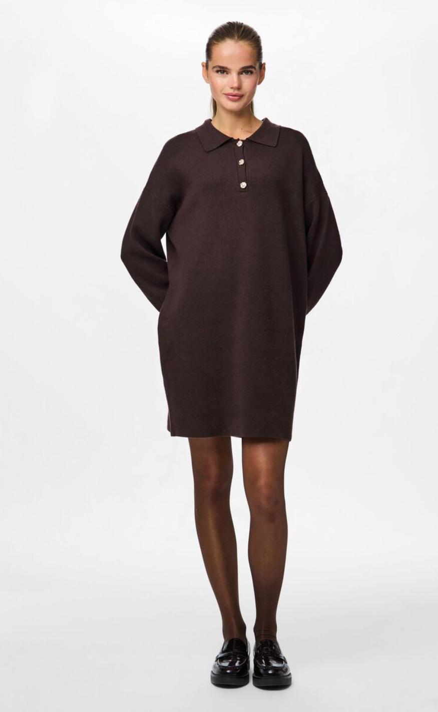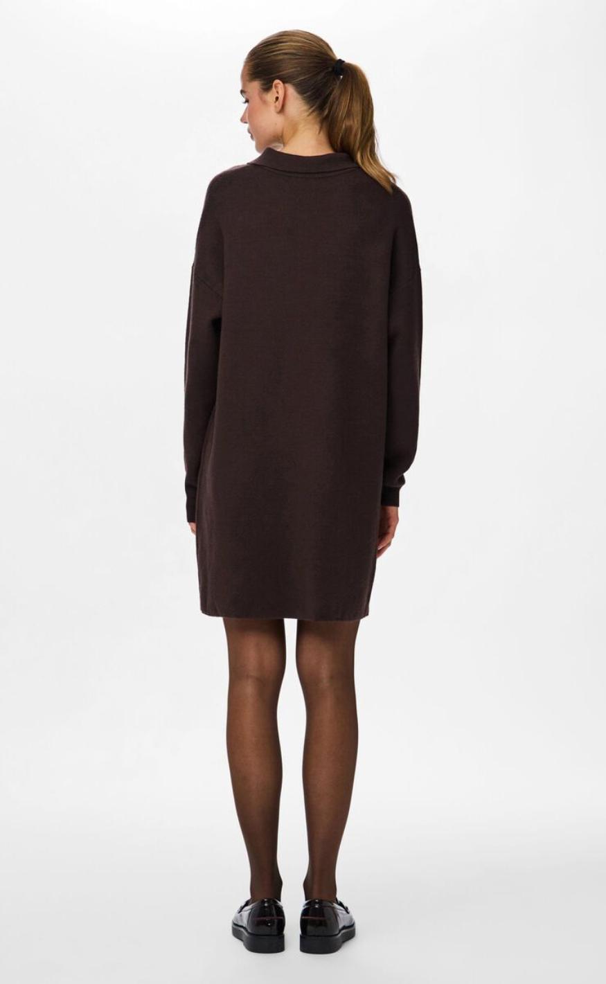 Denne kjole er lavet i blød fladstrik - en metode, der giver et lækkert, kraftigt strik med tydelig struktur og ribkanter. Designet har en klassisk polokrave med halv knaplukning, lange ærmer med ribbede kanter og en behagelig strikket pasform, der både føles og ser eksklusiv ud.