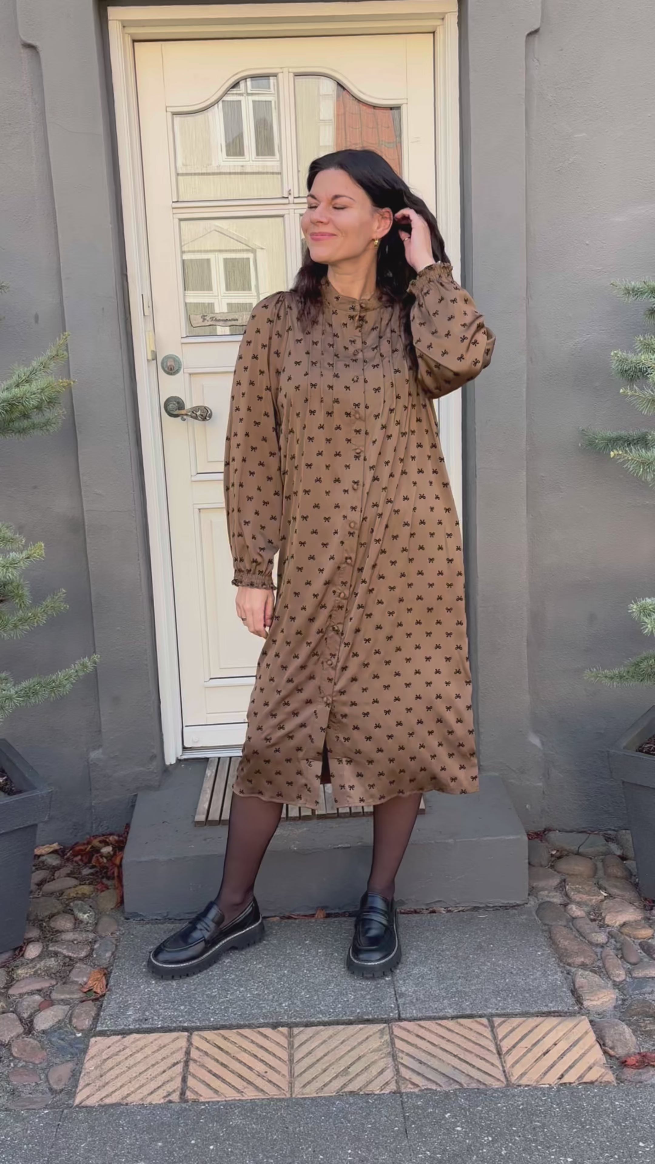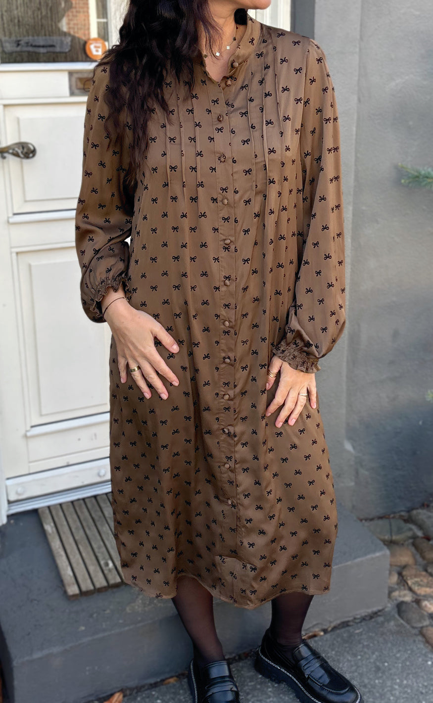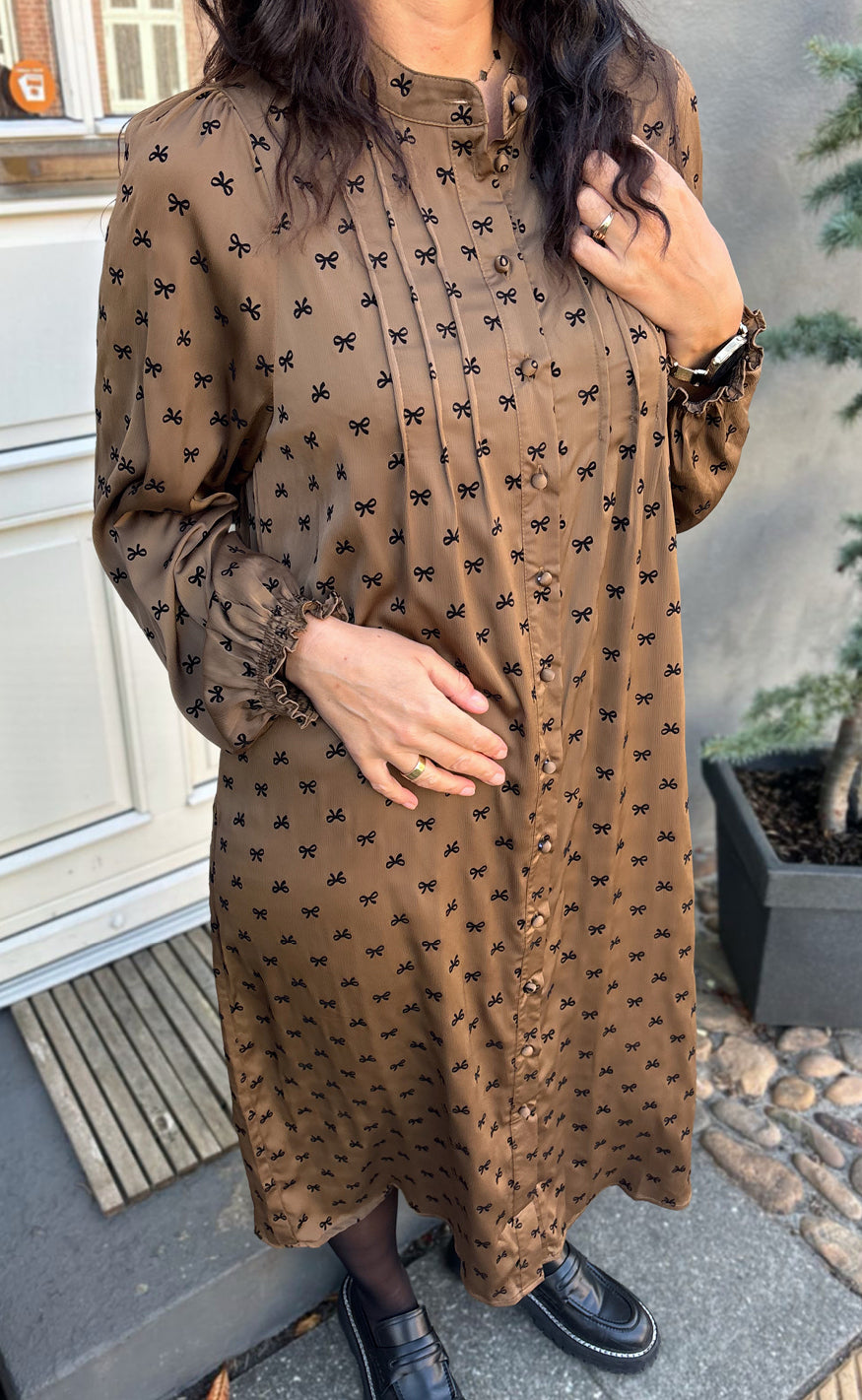 Virkelig smuk kjole fra Say INA Copenhagen i brun med sorte sløjfer.