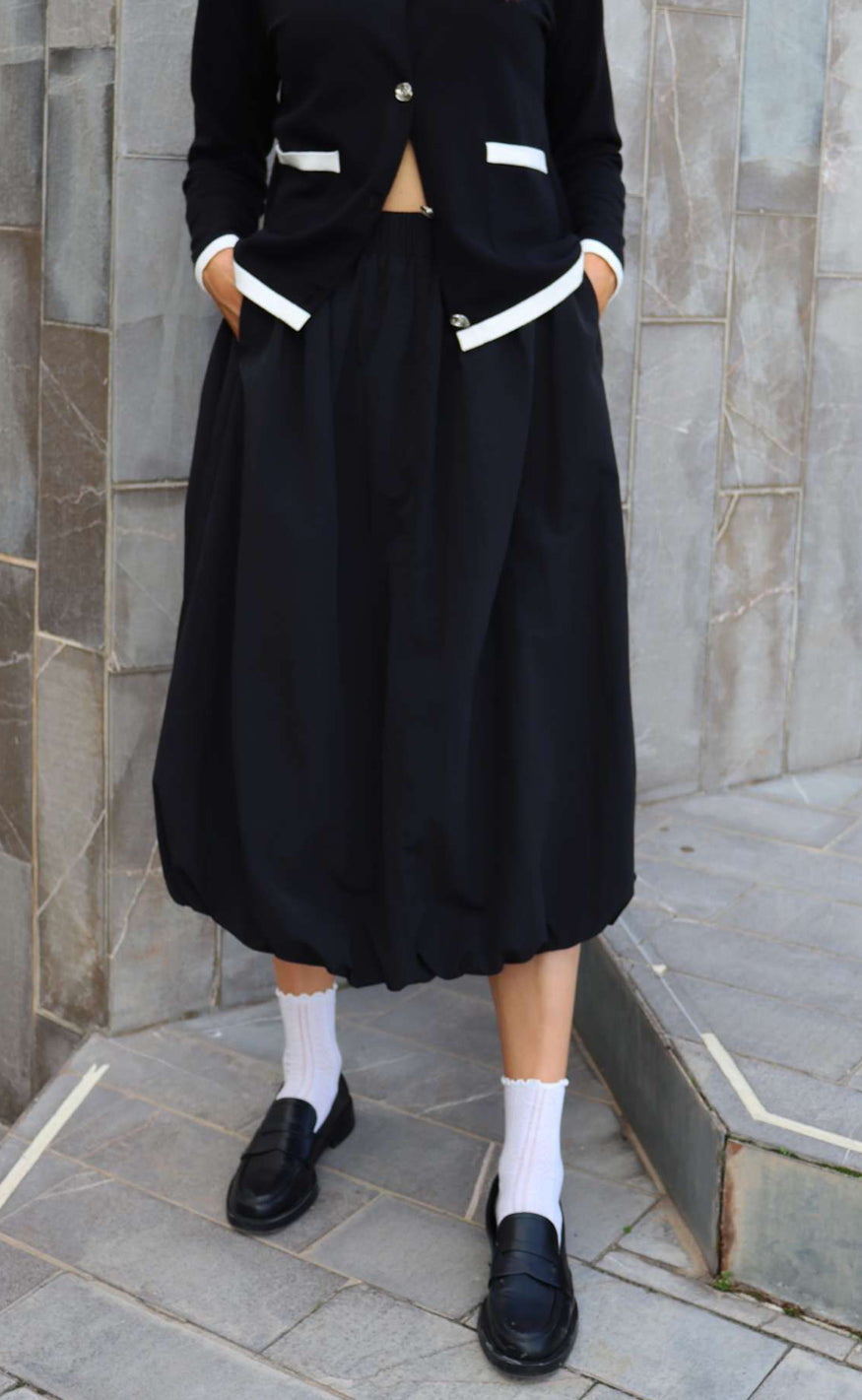 Nederdelen har elastik i taljen og en let, rummelig pasform, som giver et elegant og behageligt udtryk.