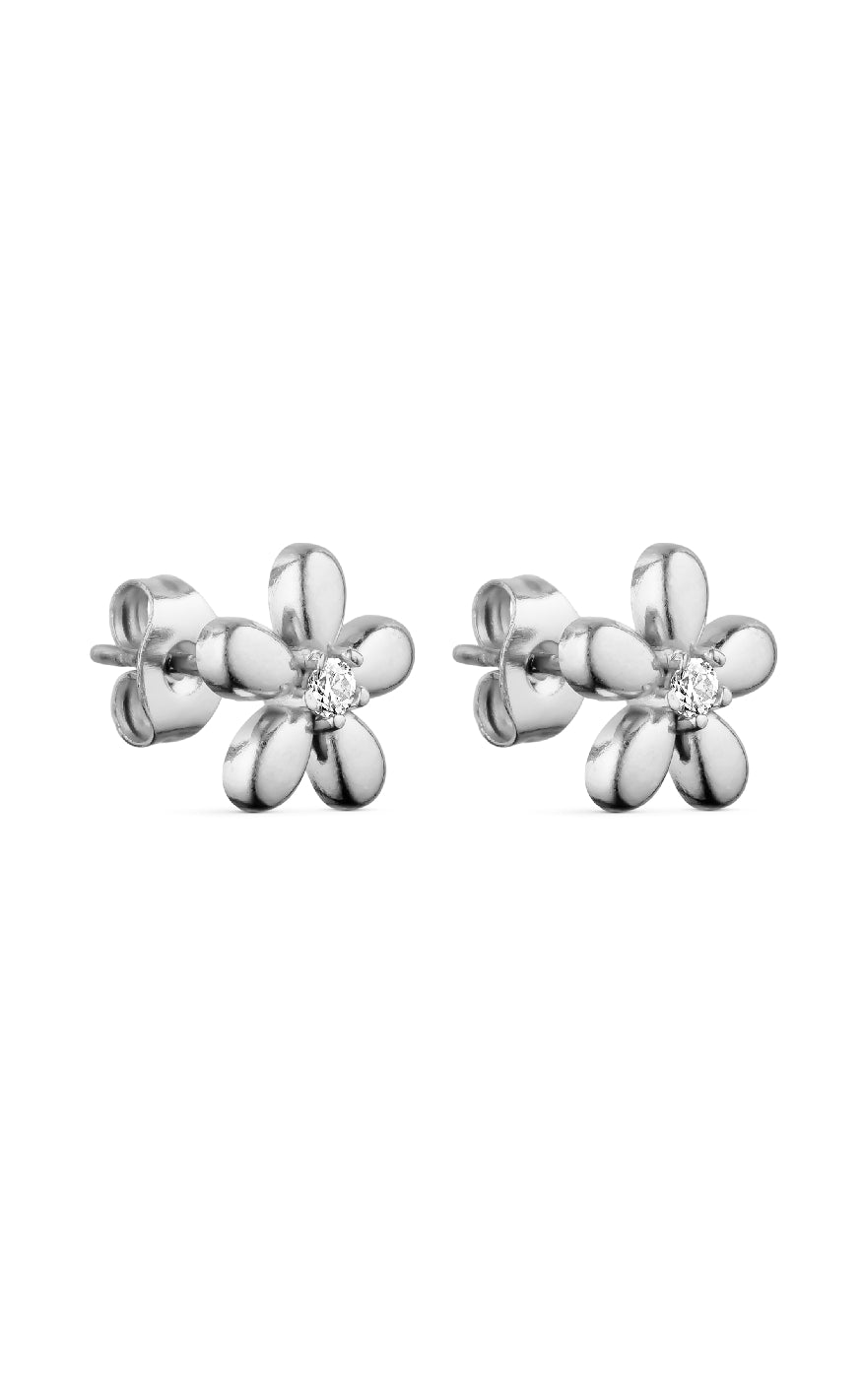 Fine studs fra Smykkeli Copenhagen i sølv formet som en blomst med en lille zirconia sten i midten.