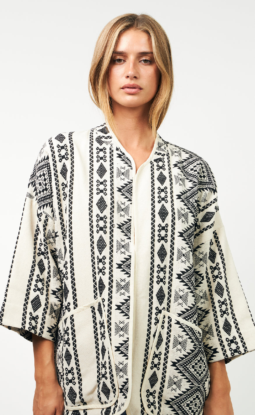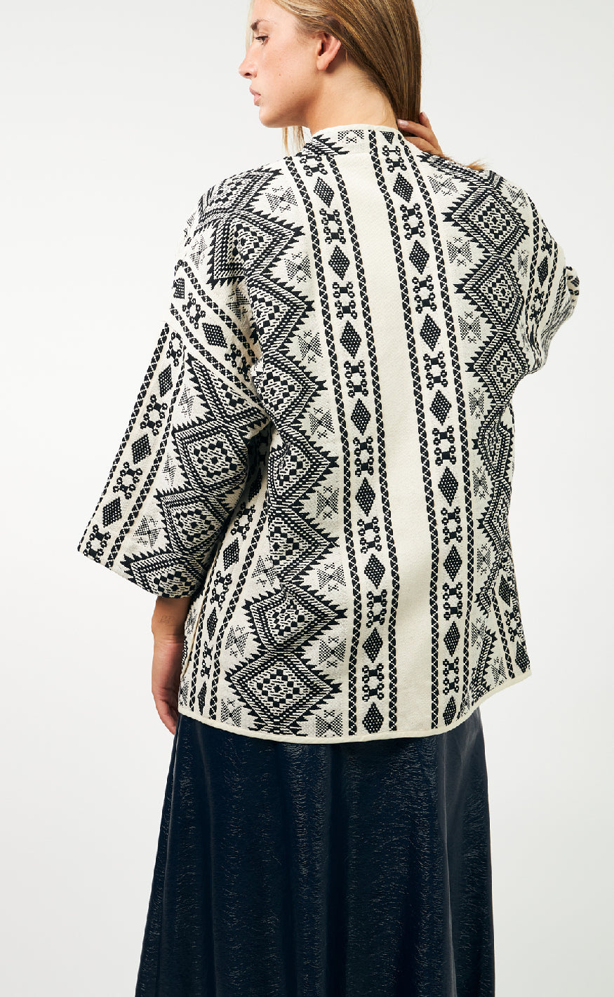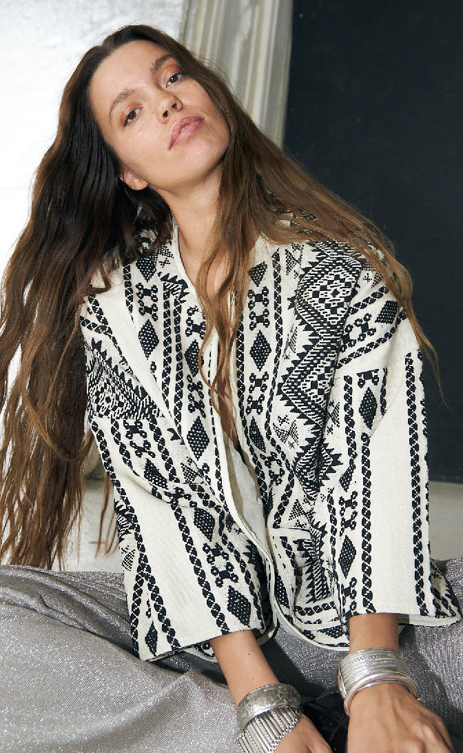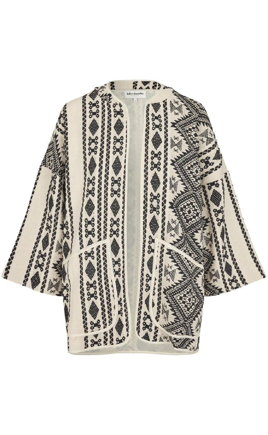 Cremefarvet jakke fra Lollys Laundry med sort etnisk-inspireret mønster og store lommer – perfekt til et afslappet og stilfuldt look.