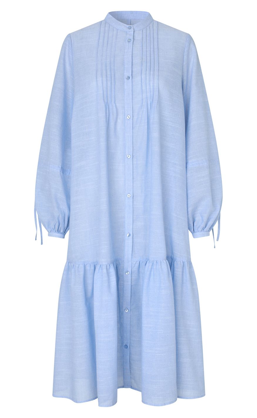 Lyseblå kjole fra Lollys Laundry med knaplukning hele vejen ned, lange ærmer med bindedetaljer og en løs pasform med let rynket skørt, som giver et let og afslappet udtryk. Kjolen kan nemt styles både til hverdag og mere pæne anledninger.