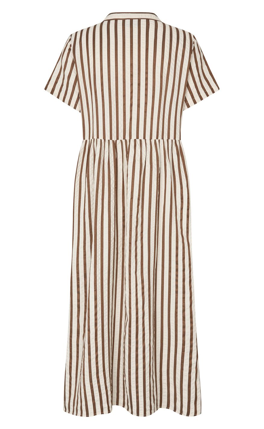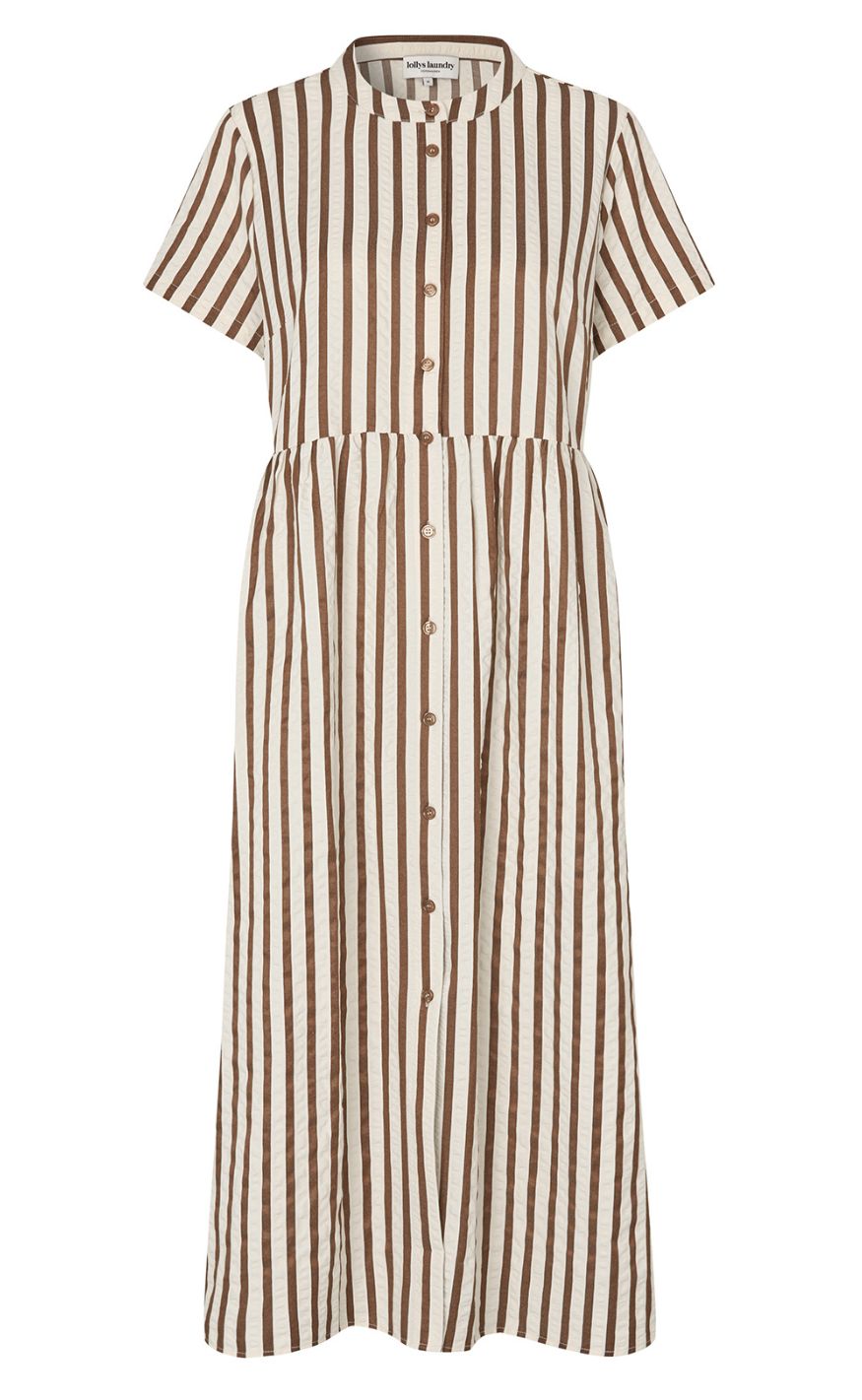 Lang kjole fra Lollys Laundry i et stribet mønster i lyse og brune nuancer. Kjolen har korte ærmer, knaplukning foran og en løs pasform med let rynket skørt, som giver et afslappet og luftigt udtryk.