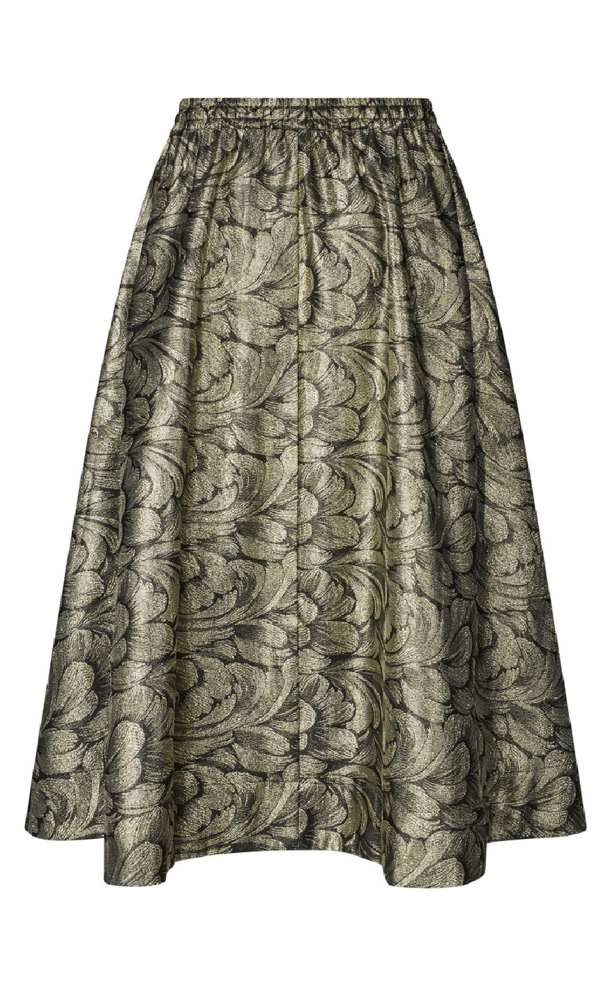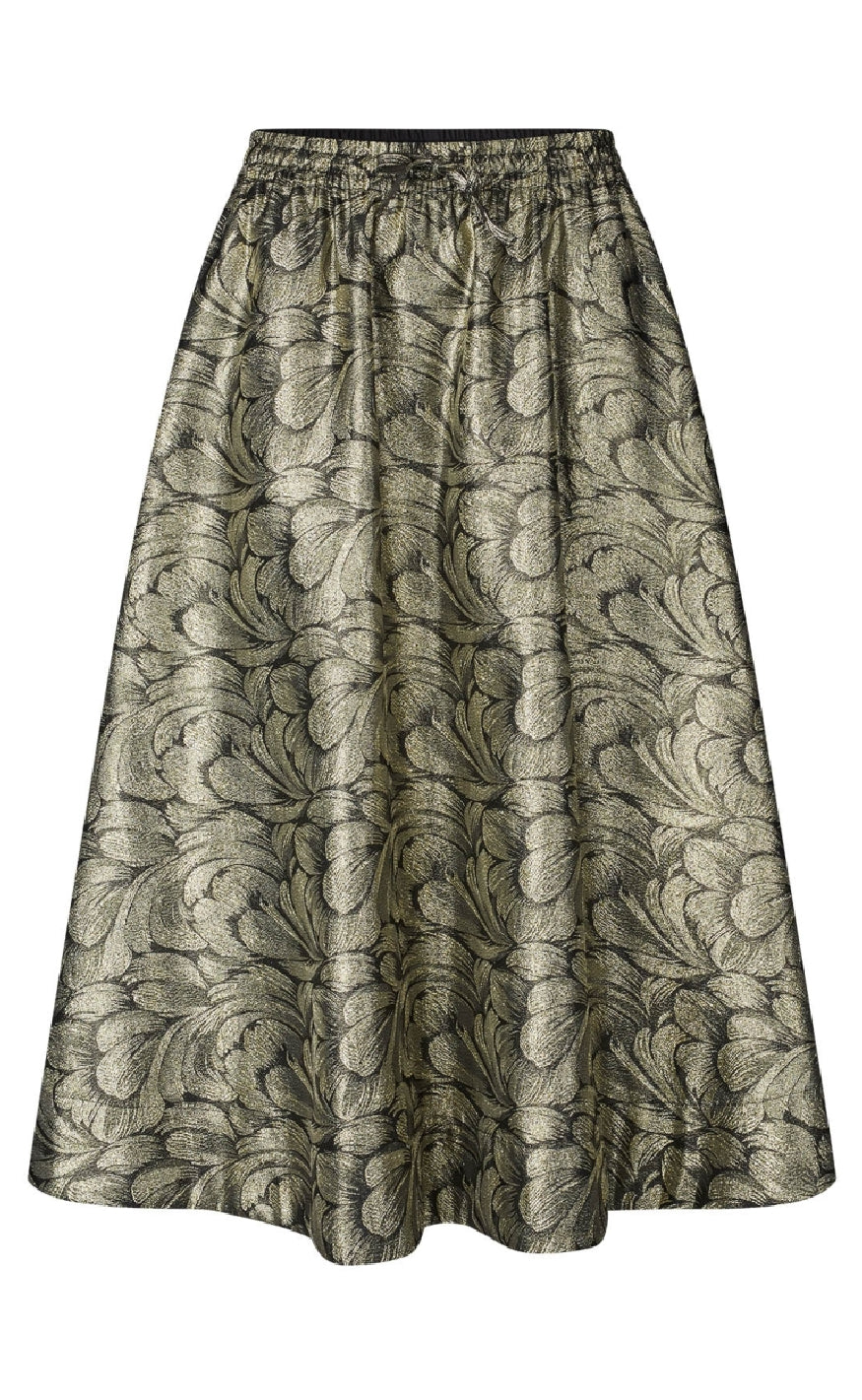 Nederdel fra Lollys Laundry med elastisk talje og metallisk bladmønster – perfekt til et festligt og elegant look.