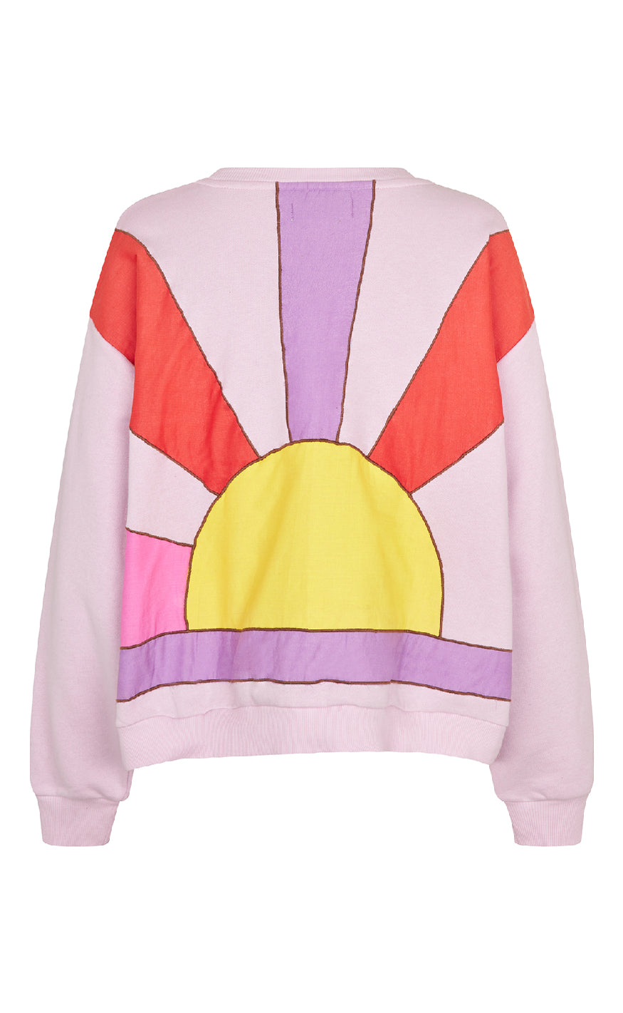 Blød sweatshirt i lys rosa med farverigt solopgangsmotiv på ryggen – et unikt og iøjnefaldende design fra Lollys Laundry.