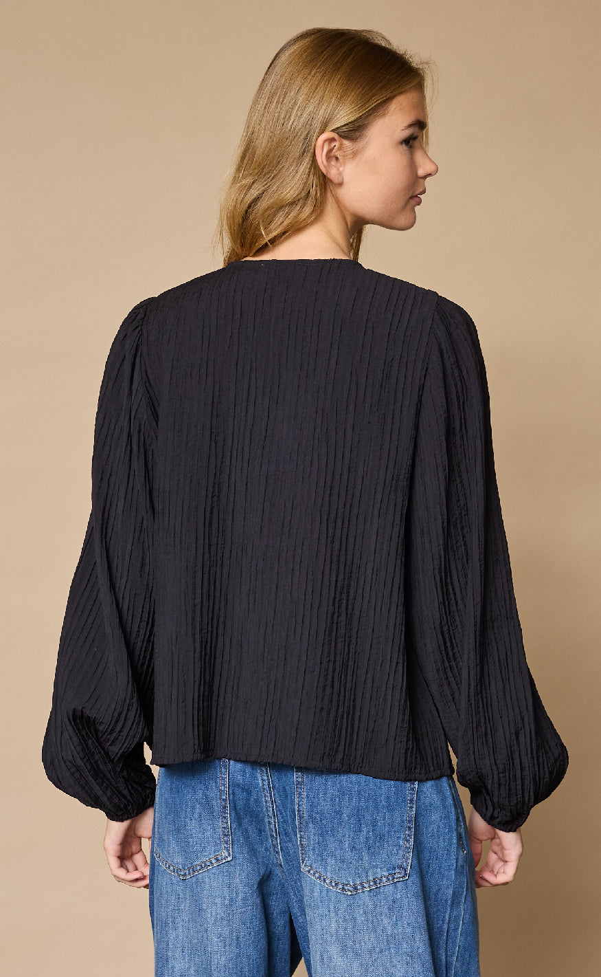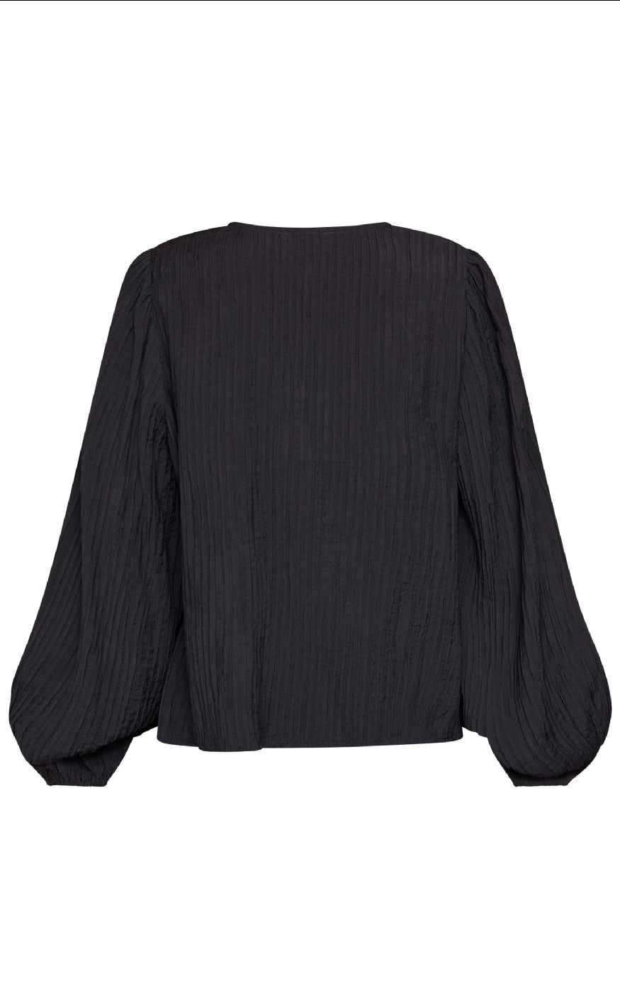 Elegant sort bluse med V-hals, lange ballonærmer og dekorative blomsterdetaljer foran – perfekt til både hverdag og fest.