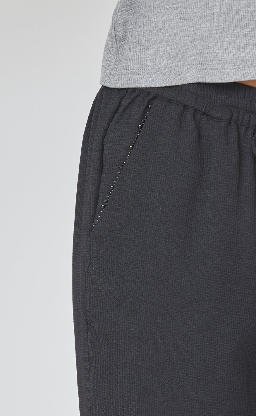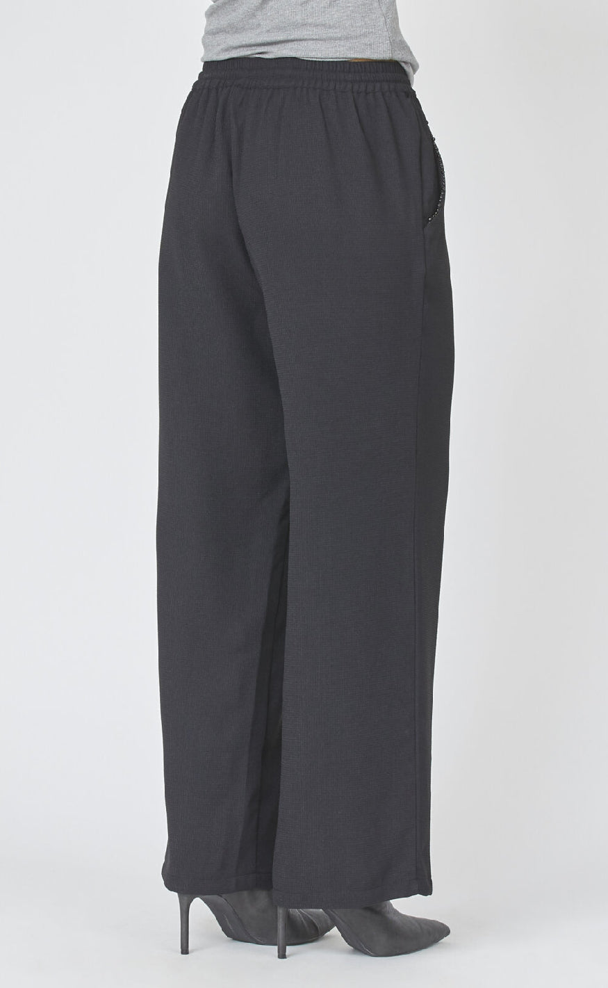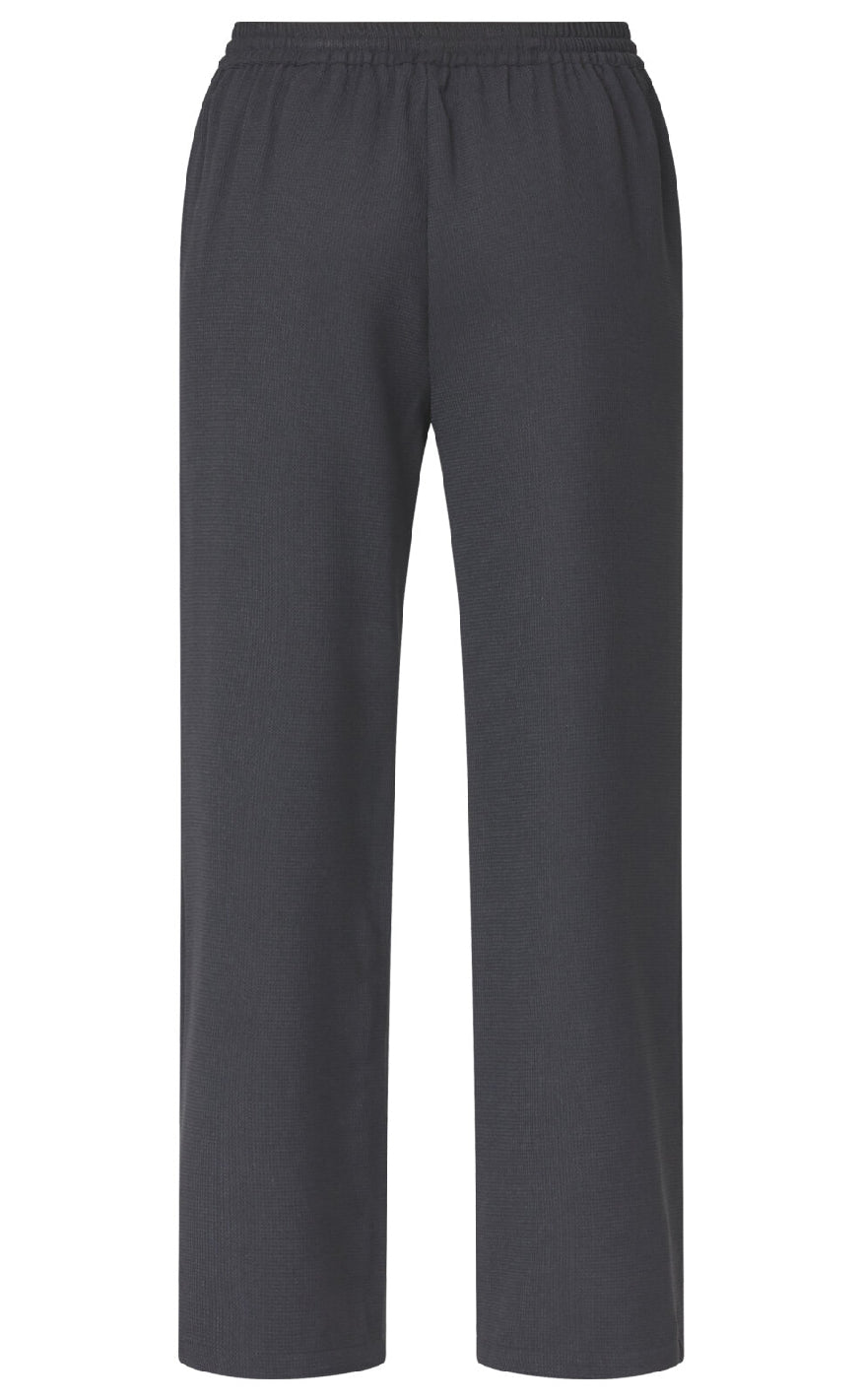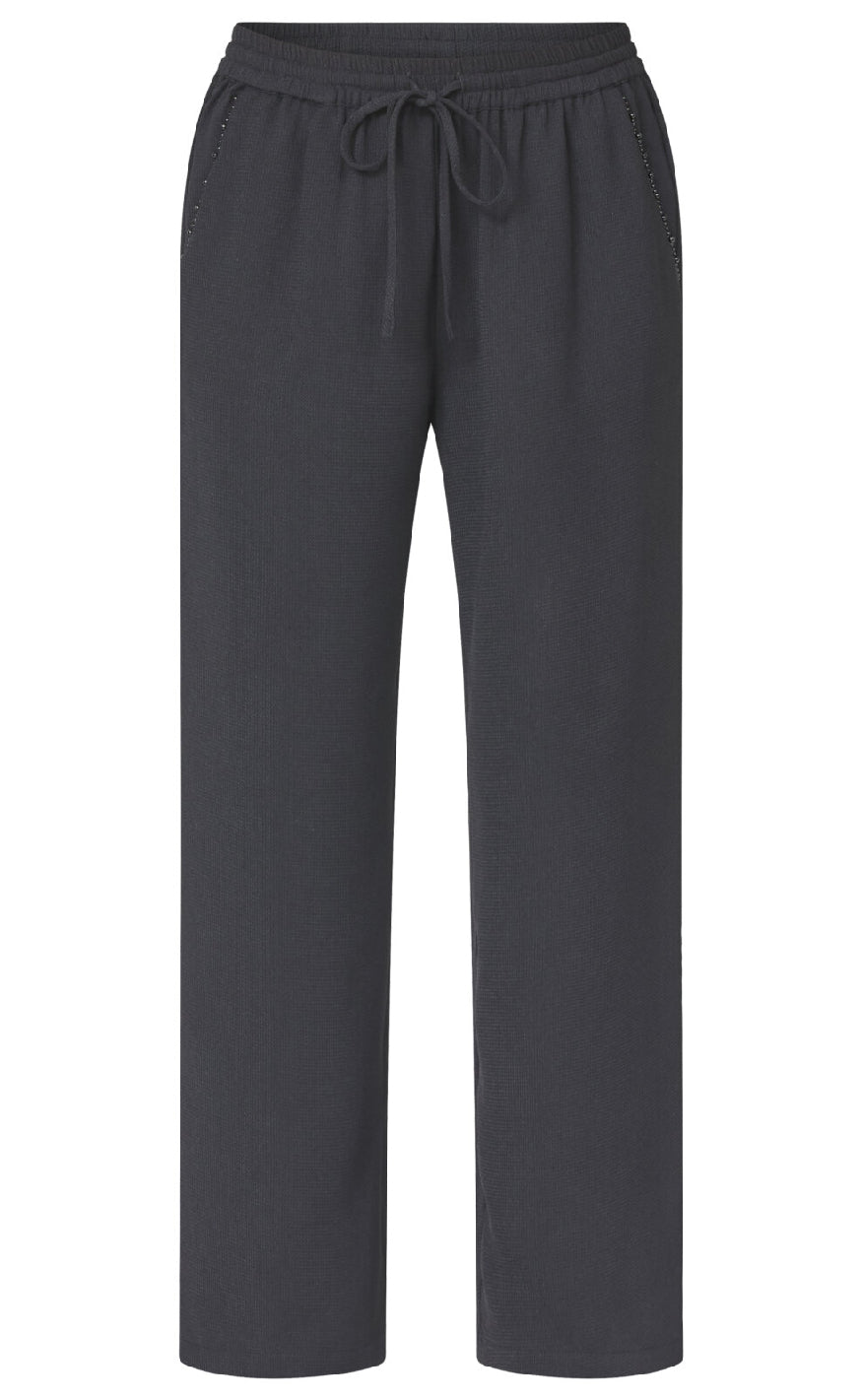Mørkegrå bukser fra Love & Divine med elastisk talje, bindebånd og lige ben – en komfortabel og stilren style til hverdagsbrug.
