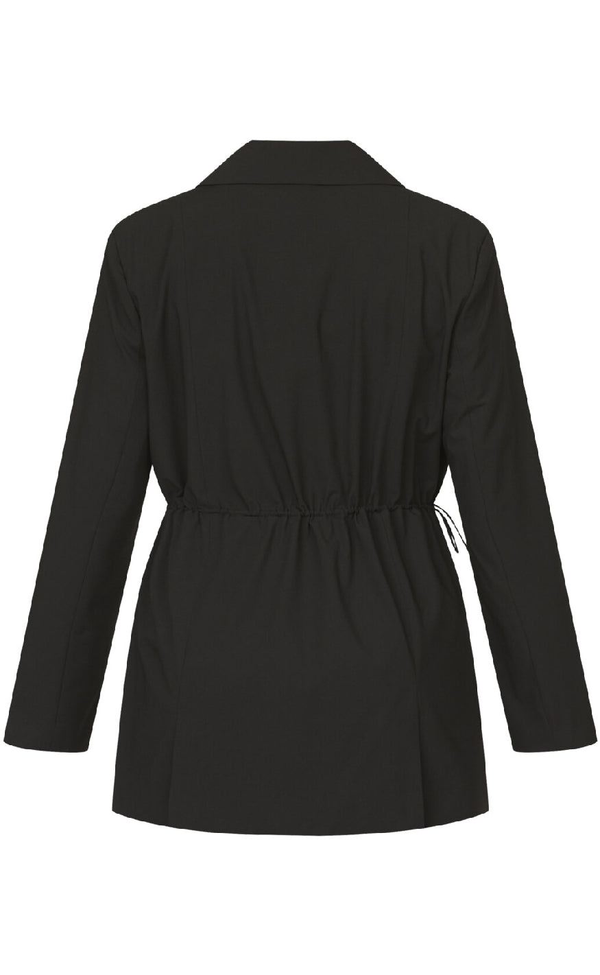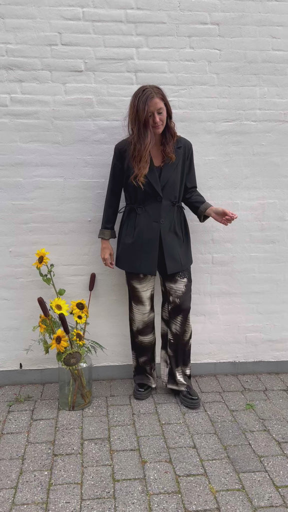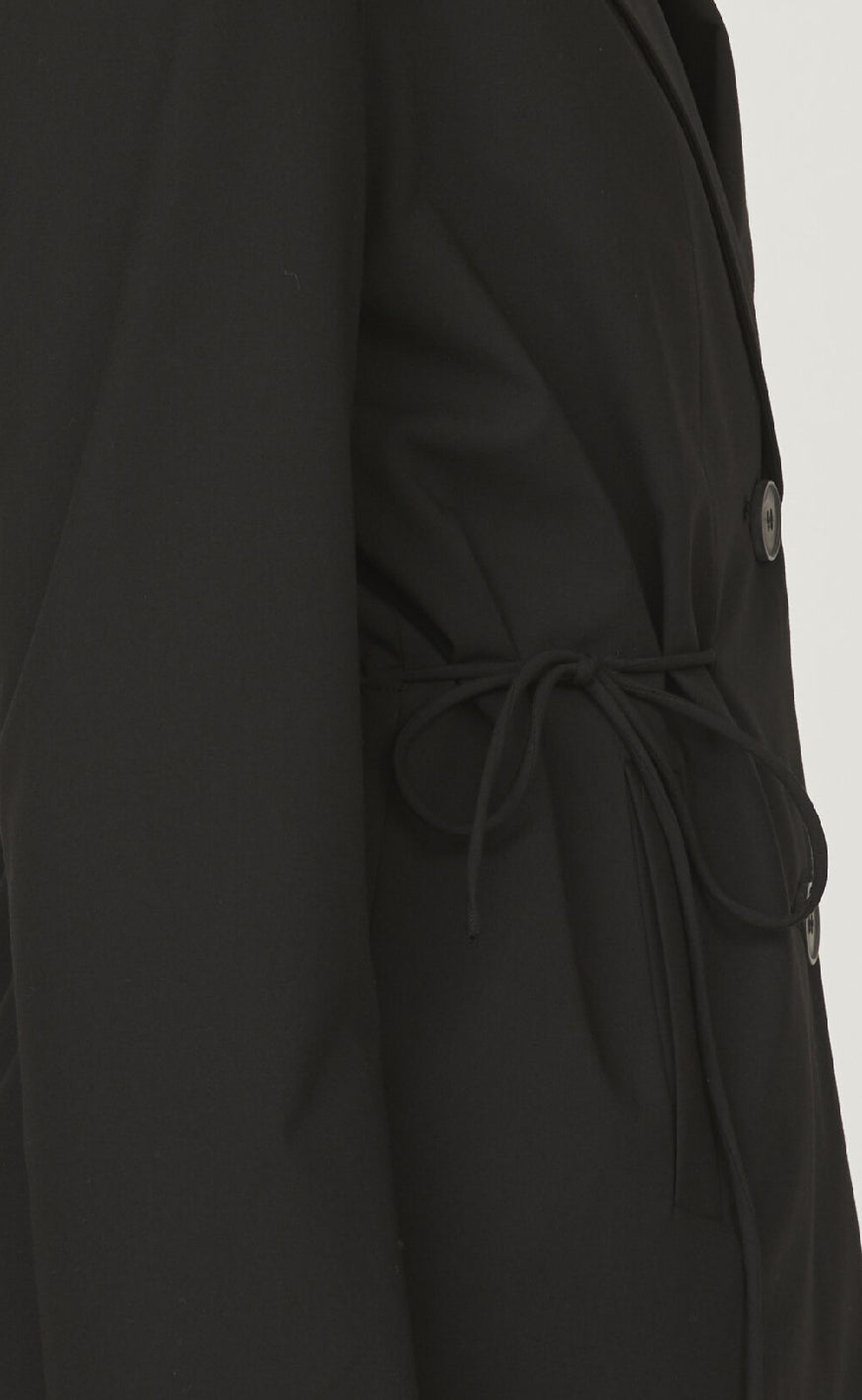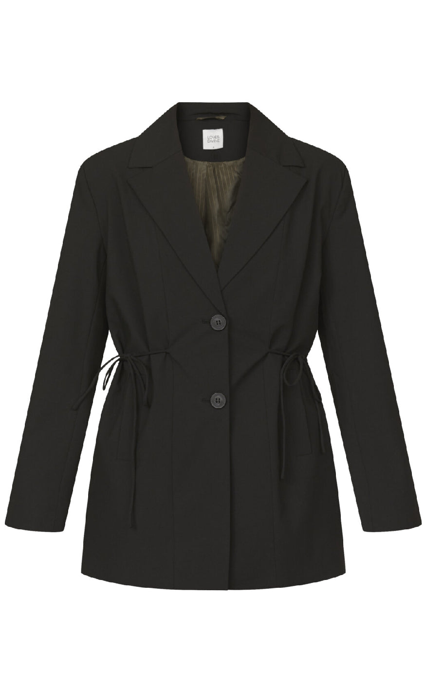Sort blazer fra Love & Divine med klassisk revers og to-knaplukning, designet med justerbare bindebånd i taljen for et feminint og moderne udtryk.