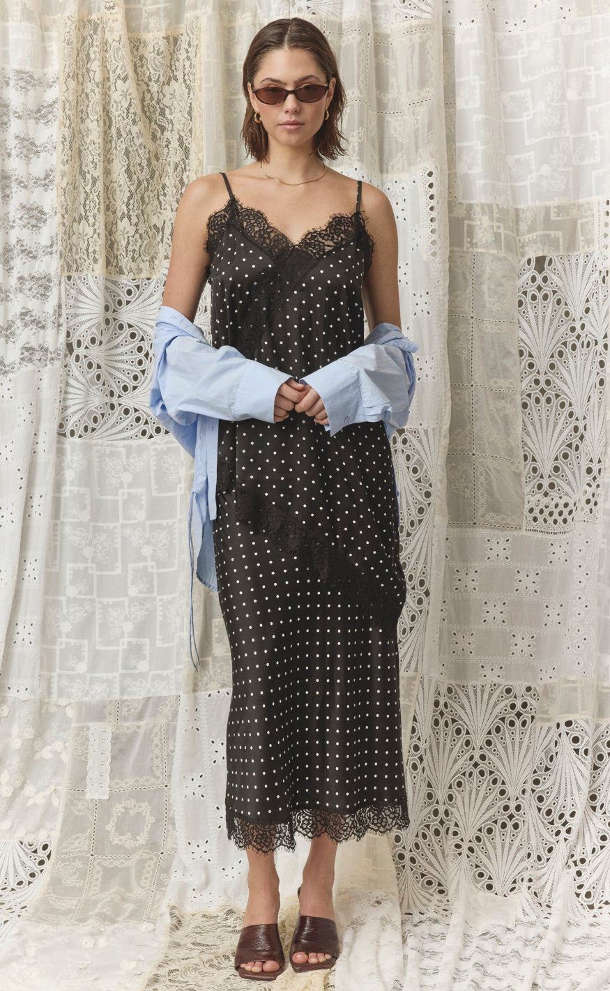 Smuk og afslappet satin kjole fra Love & Divine i et sort prikket mønster, med blondekant.