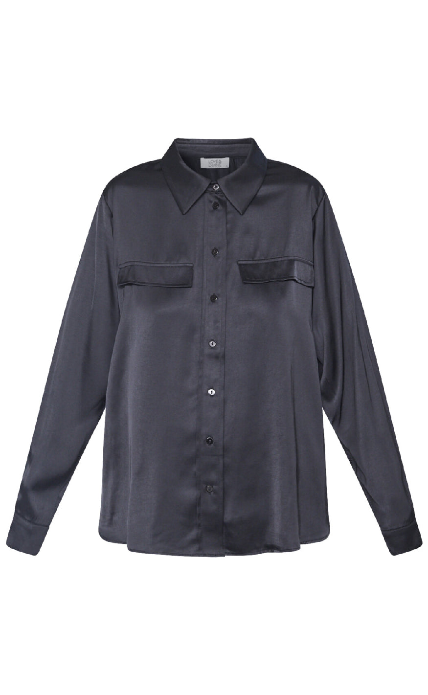 Sort skjorte fra Love & Divine i glansfuld satin-look med klassisk krave, knaplukning og to dekorative brystlommer – perfekt til et elegant og moderne outfit.