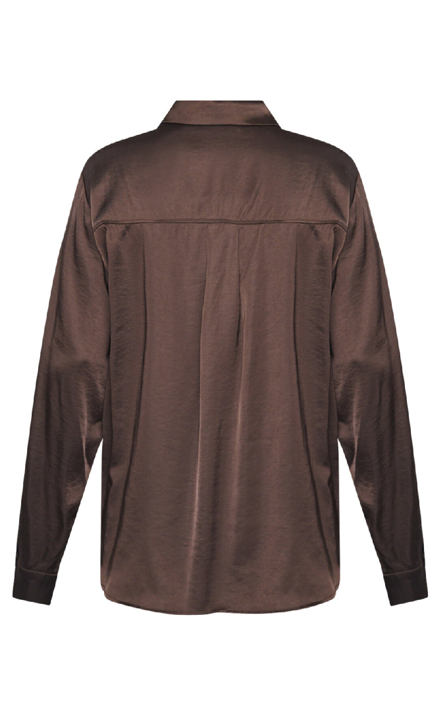 Brun skjorte fra Love & Divine i glansfuld satin-look med klassisk krave, knaplukning og to dekorative brystlommer – perfekt til et elegant og moderne outfit.
