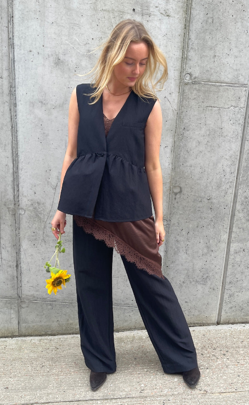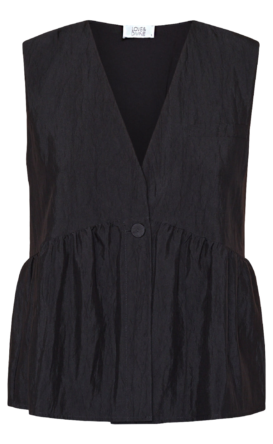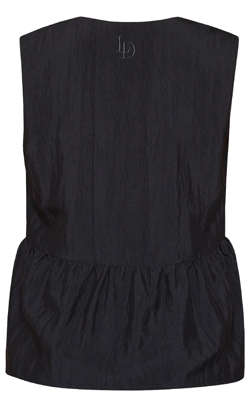 Toppen har en knaplukning, peplum effekt samt er toppen ærmeløs.