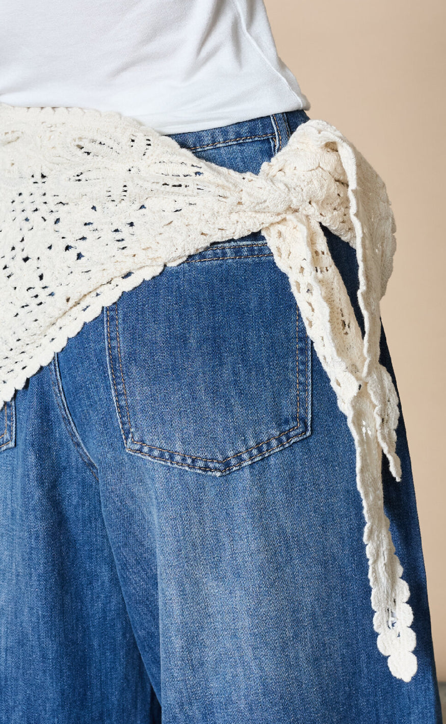 Tørklædet har en asymmetrisk form og bindes i siden, perfekt som et boheme-inspireret accessory til sommerens outfits.