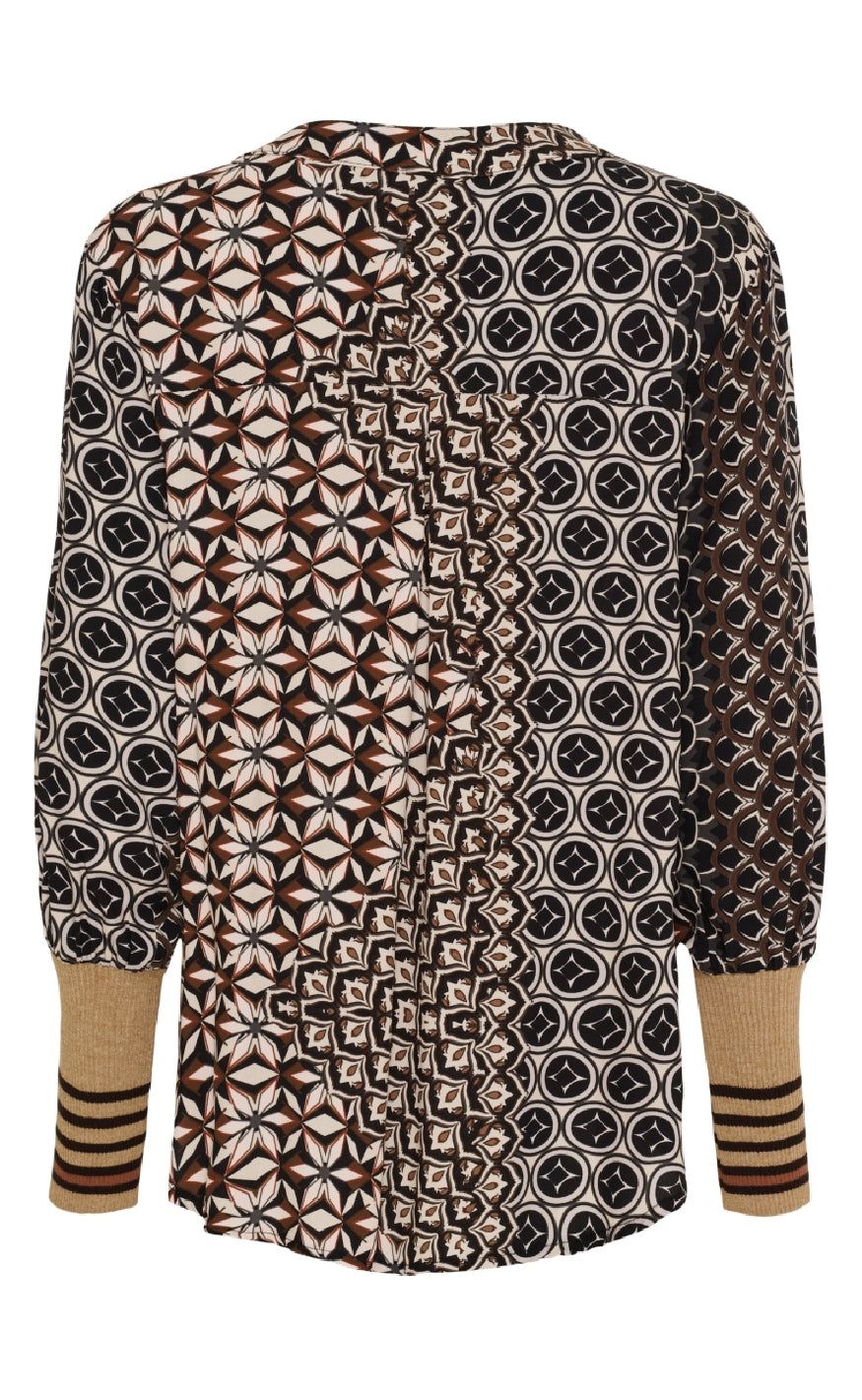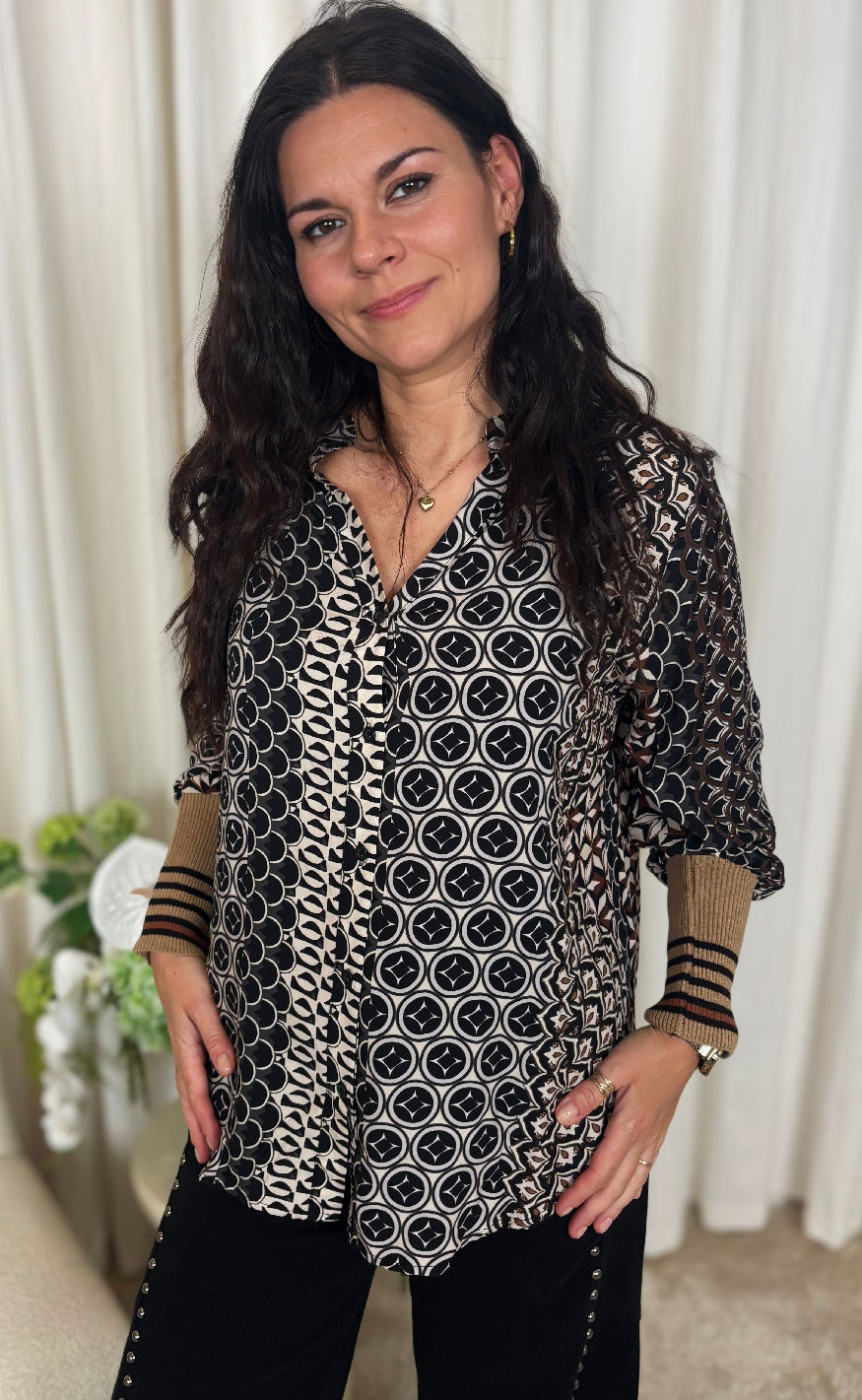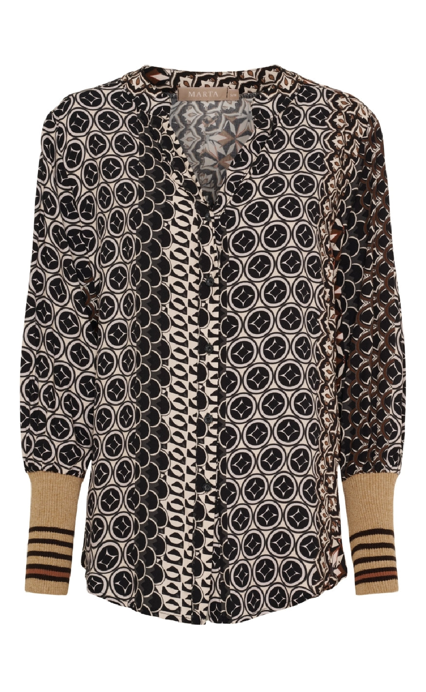 Flot mønstret skjorte fra Marta. Skjorten har et mønster i sort og beige med små detaljer i brun. De lange ærmer afsluttes med brede ribmanchetter i striber.