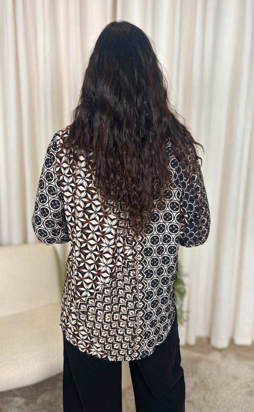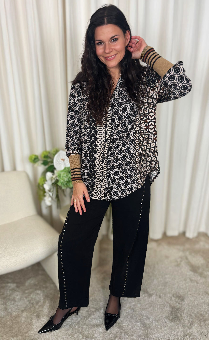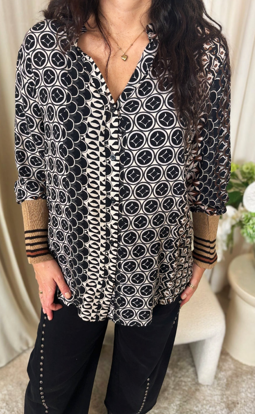 Flot mønstret skjorte fra Marta. Skjorten har et mønster i sort og beige med små detaljer i brun. De lange ærmer afsluttes med brede ribmanchetter i striber.