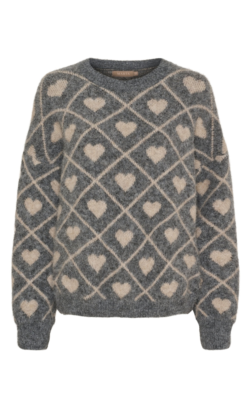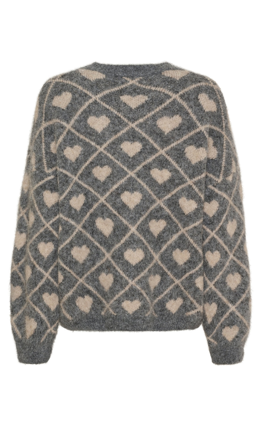 Blød striktrøje i grå med ternet mønster og søde hvide hjerter, der giver et legende og feminint udtryk.