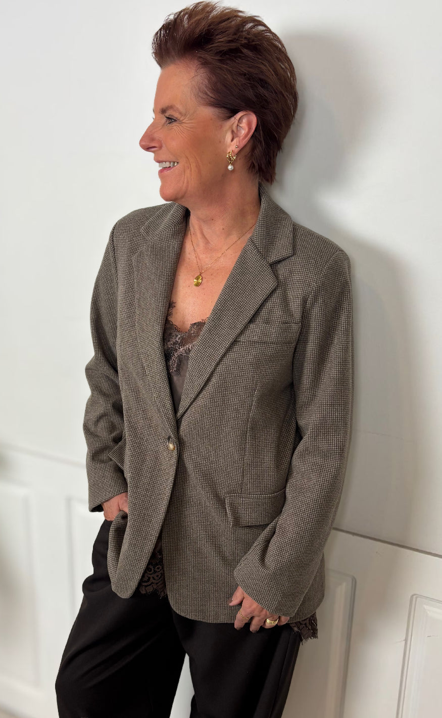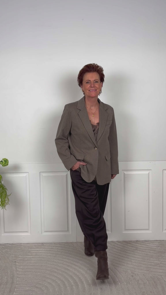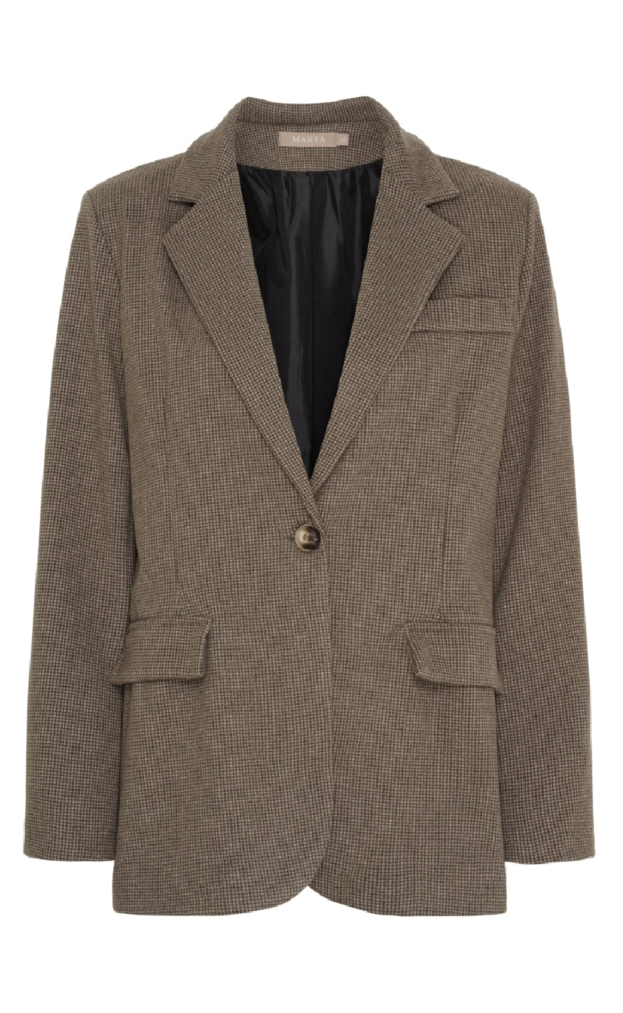 Blazeren har en enkelt knaplukning, reverskrave og to frontlommer med klap, samt en brystlomme som detalje. Den har et tidløst og elegant design, perfekt til både business og casual styling.