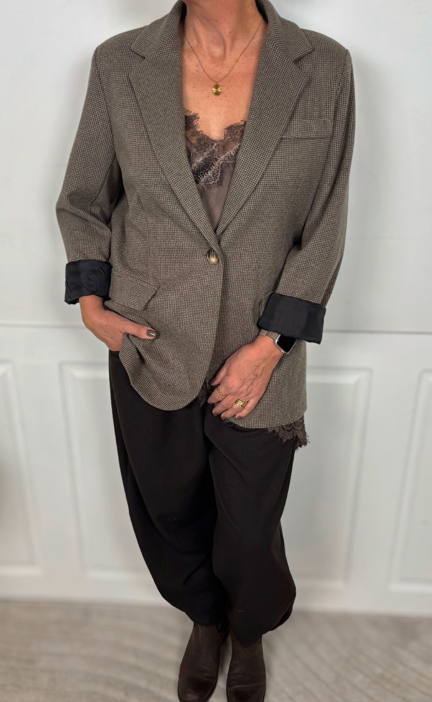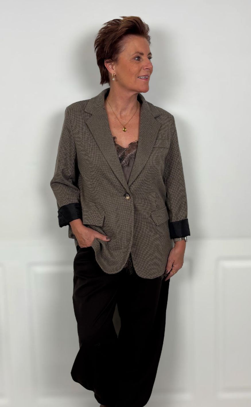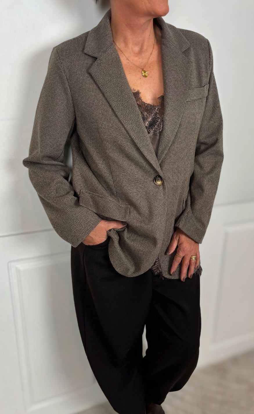 Blazeren har en enkelt knaplukning, reverskrave og to frontlommer med klap, samt en brystlomme som detalje. Den har et tidløst og elegant design, perfekt til både business og casual styling.