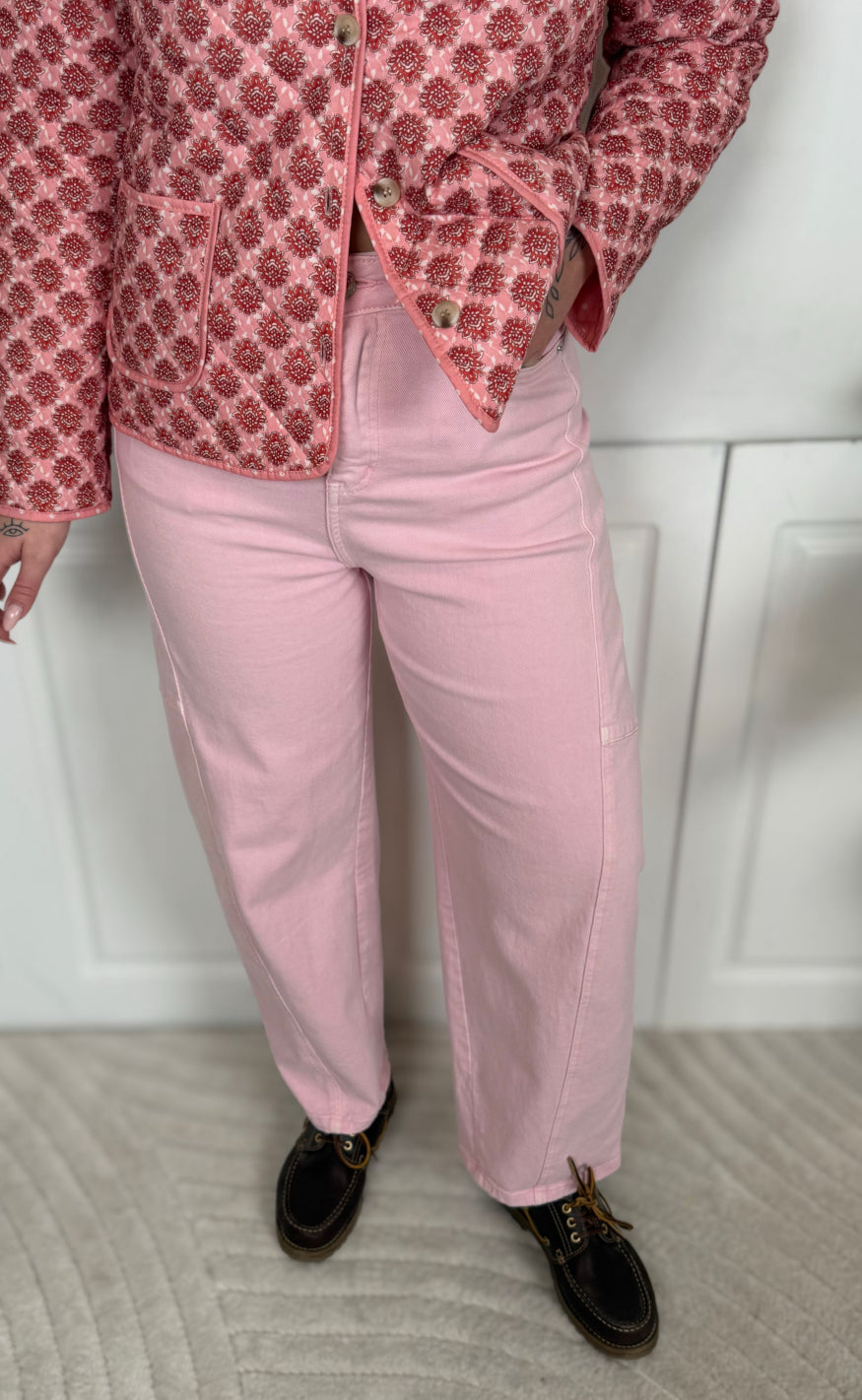 Bukserne har høj talje, lige ben og klassisk fem‑lomme design, som giver et tidløst og alsidigt udtryk – perfekte til både hverdag og pænere brug.