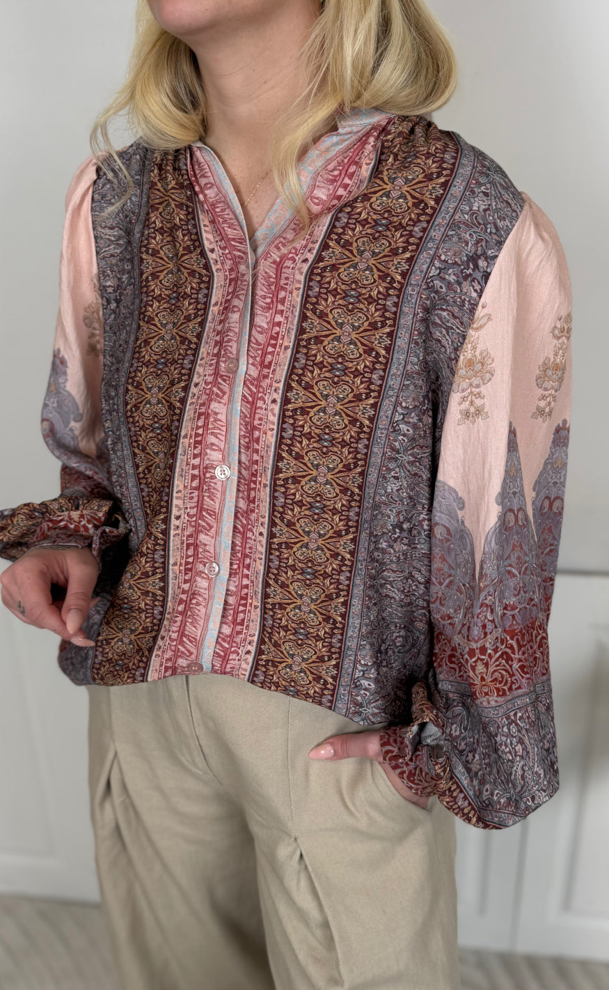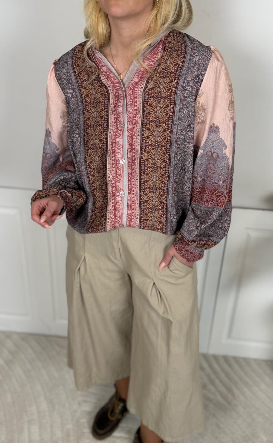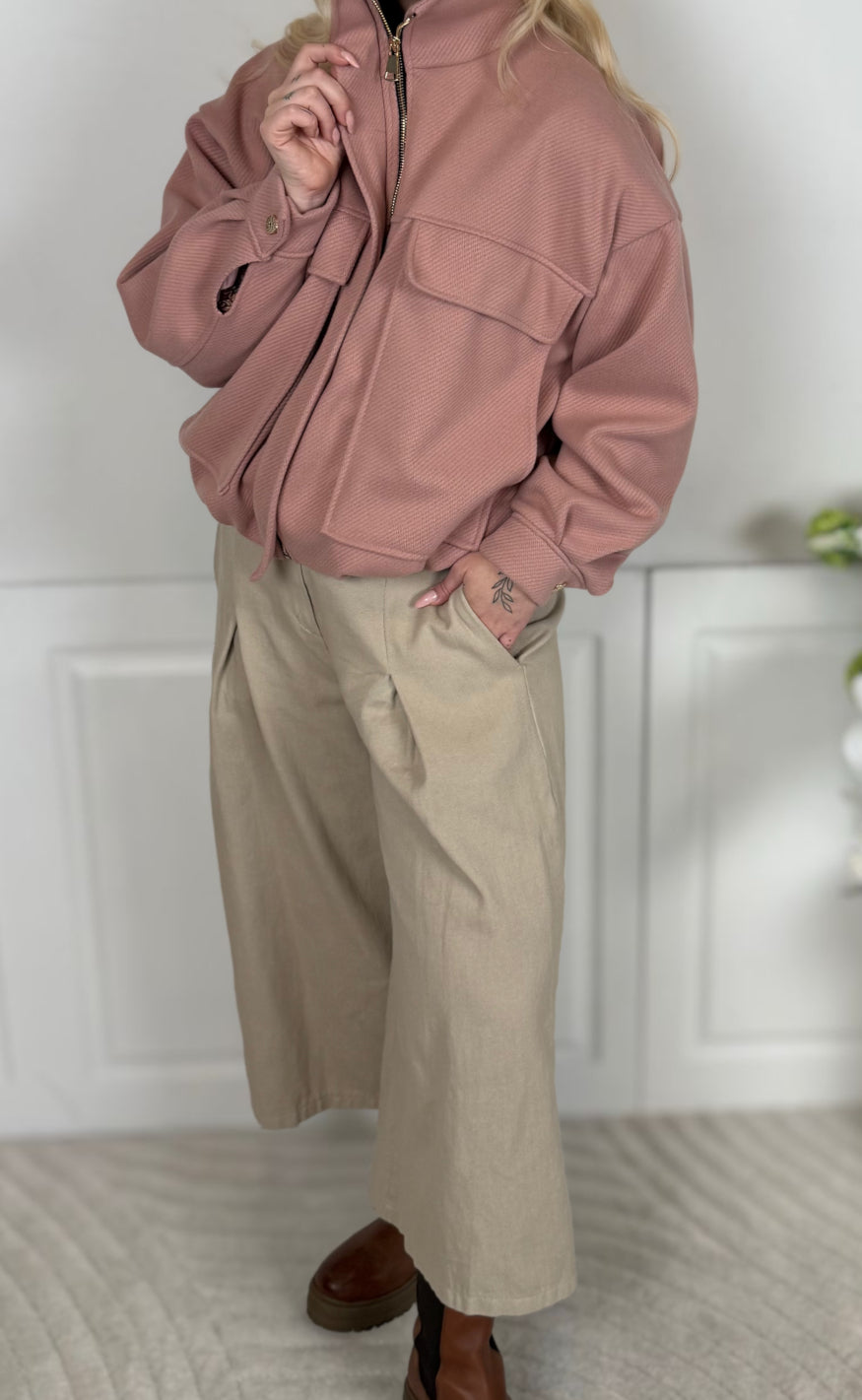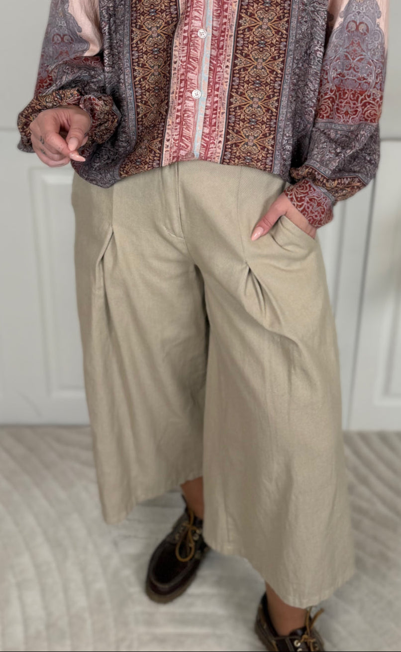 Bukserne har høj talje med klassisk lukning foran, diskrete læg og brede ben, som giver et sofistikeret og feminint udtryk – perfekte både til hverdag og pænere styling.