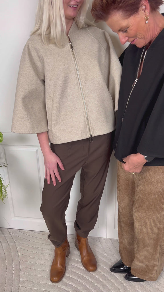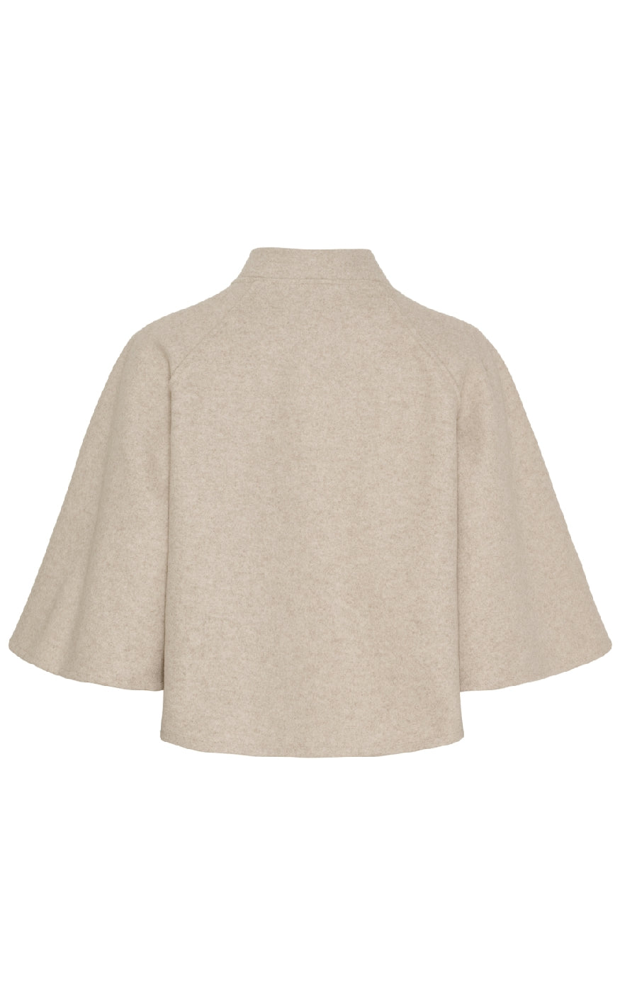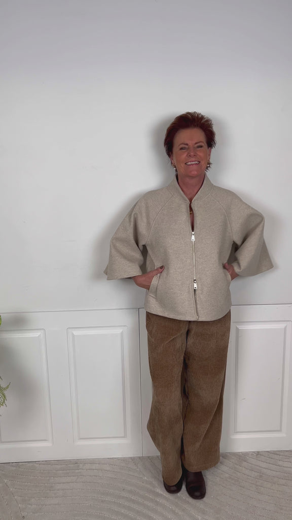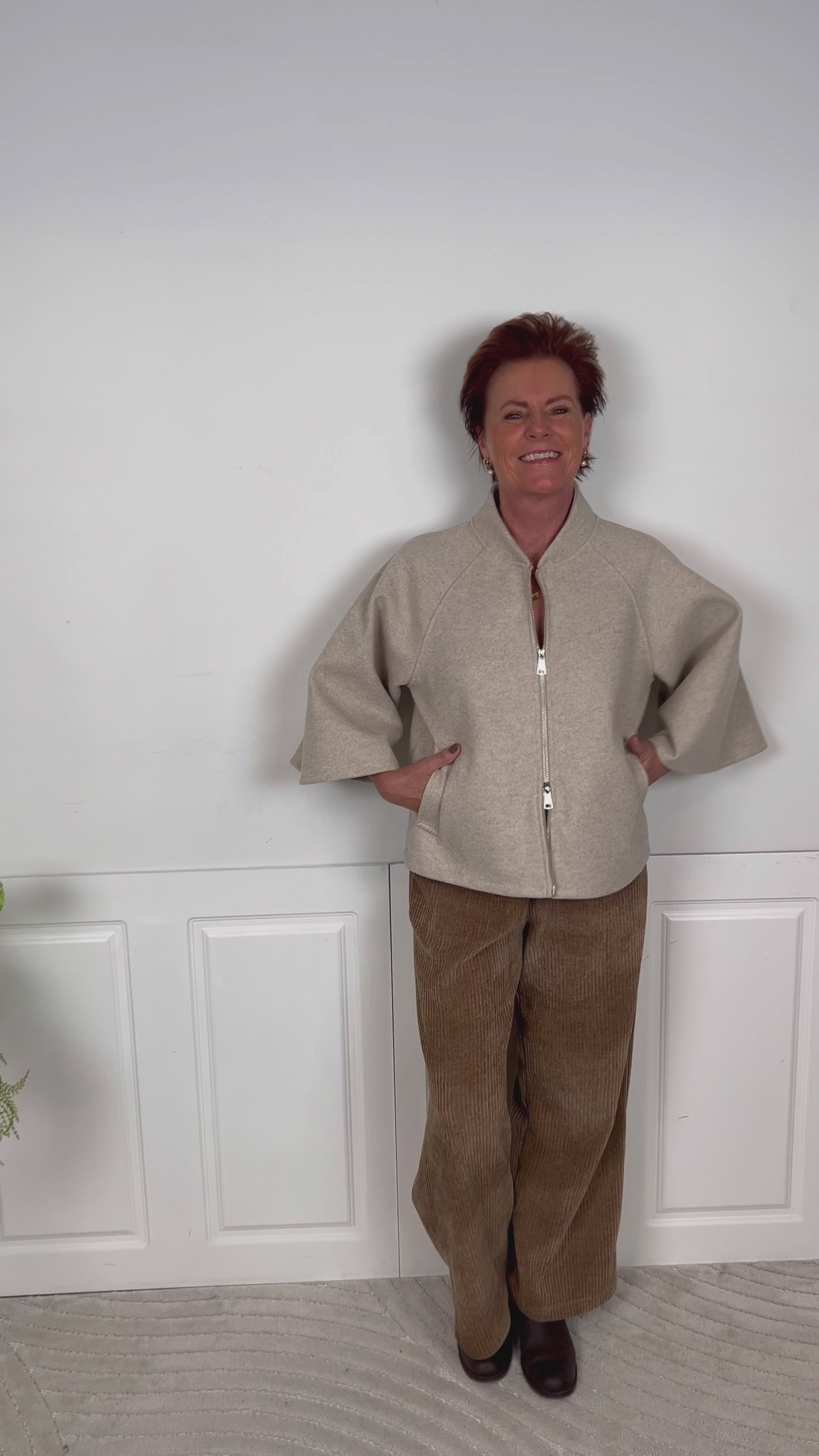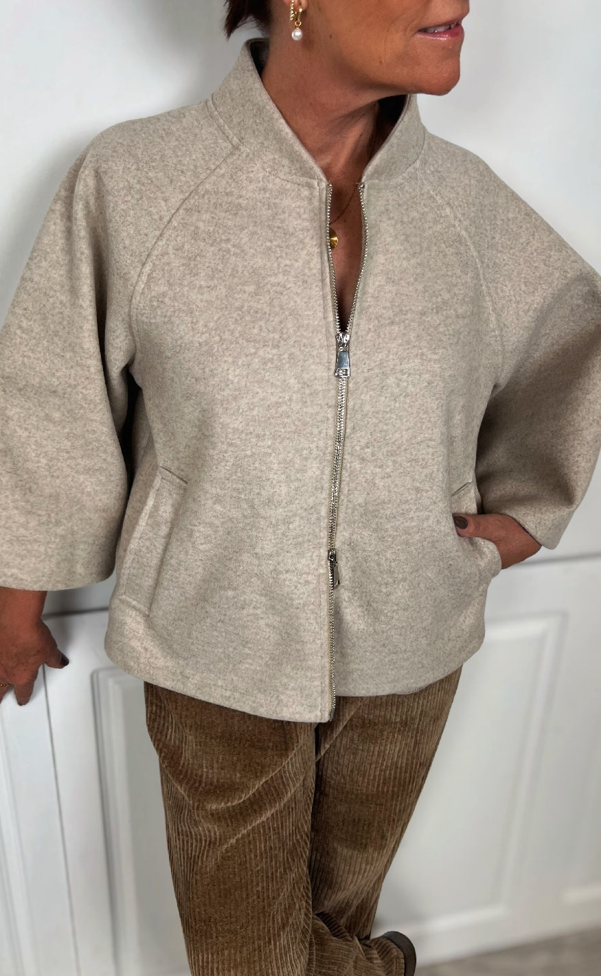 Jakken har en høj krave, lynlåslukning foran og to praktiske sidelommer. Den har en løs pasform og 3/4-ærmer, som giver et moderne og stilrent look – perfekt til overgangssæsonen.