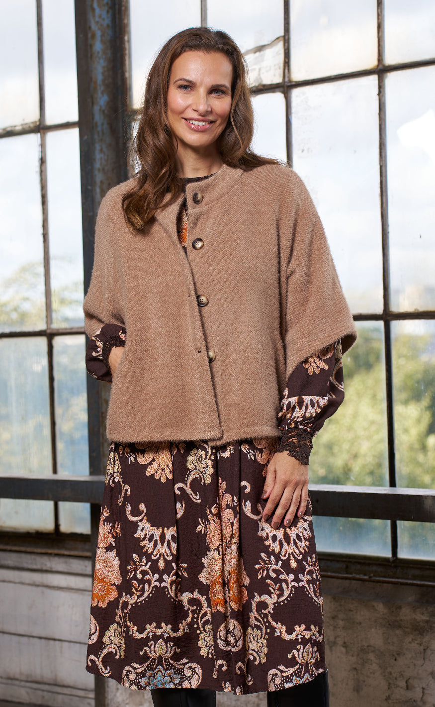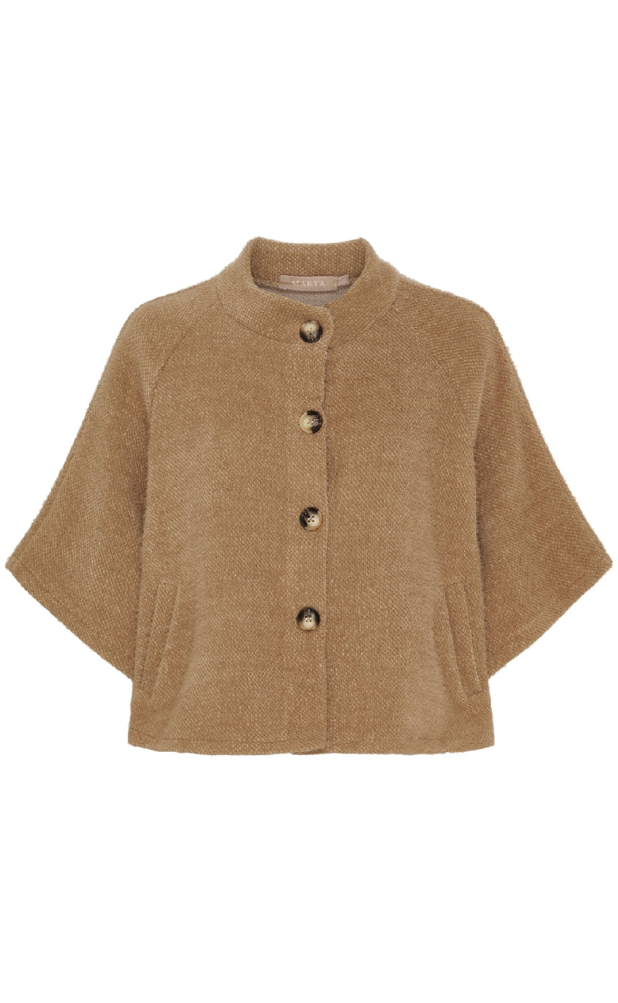 Elegant jakke/cardigan fra Marta i en skøn karamel farve med dekorative knapper i fronten og store ærmer. Skøn til både hverdag og pænere lejligheder.