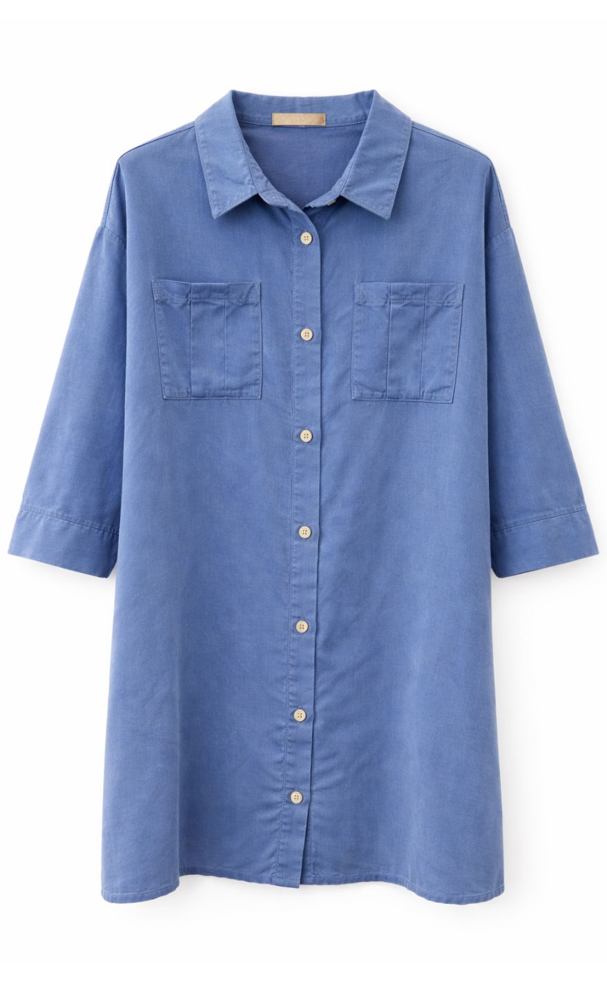 Afslappet og feminin skjortekjole fra Marta Du Chateau i en smuk støvet blå nuance.