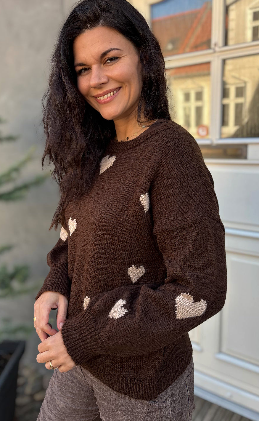 Dejlig striktrøje fra Marta Du Chateau i brun med hjerter.