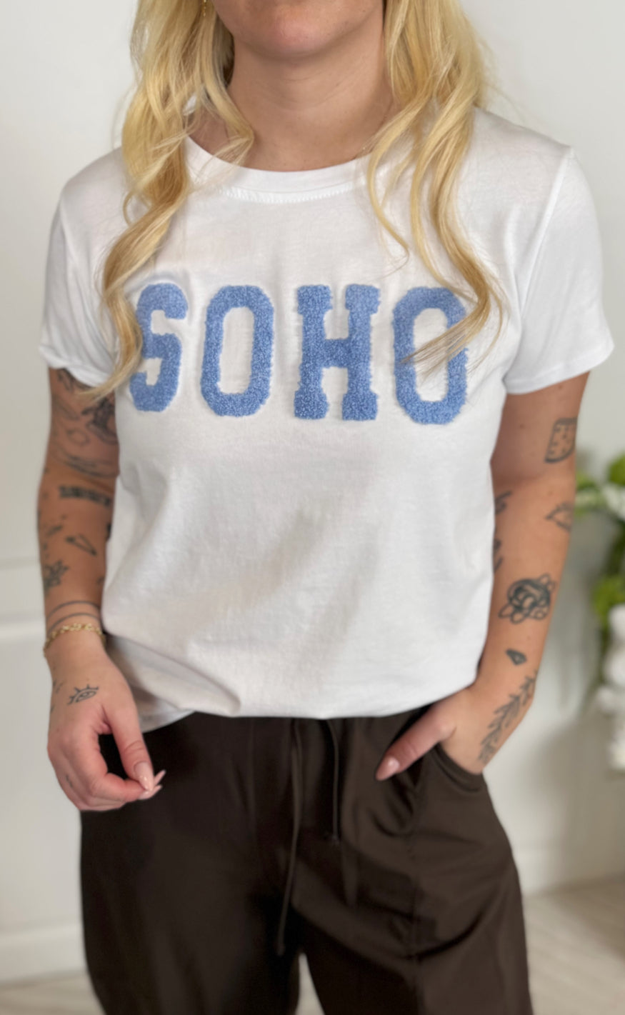 "SOHO" står fremhævet på brystet i store, teksturerede bogstaver – et enkelt men trendy statement-piece