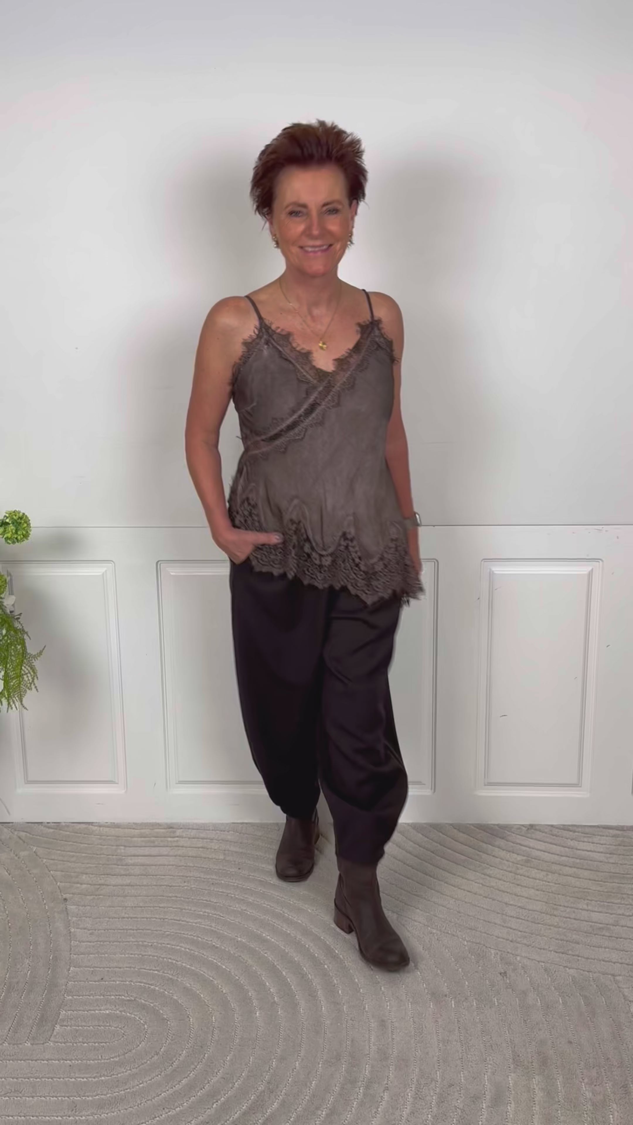 Brun top fra Marta Du Chateau med fine blondekanter langs udskæringen og forneden.