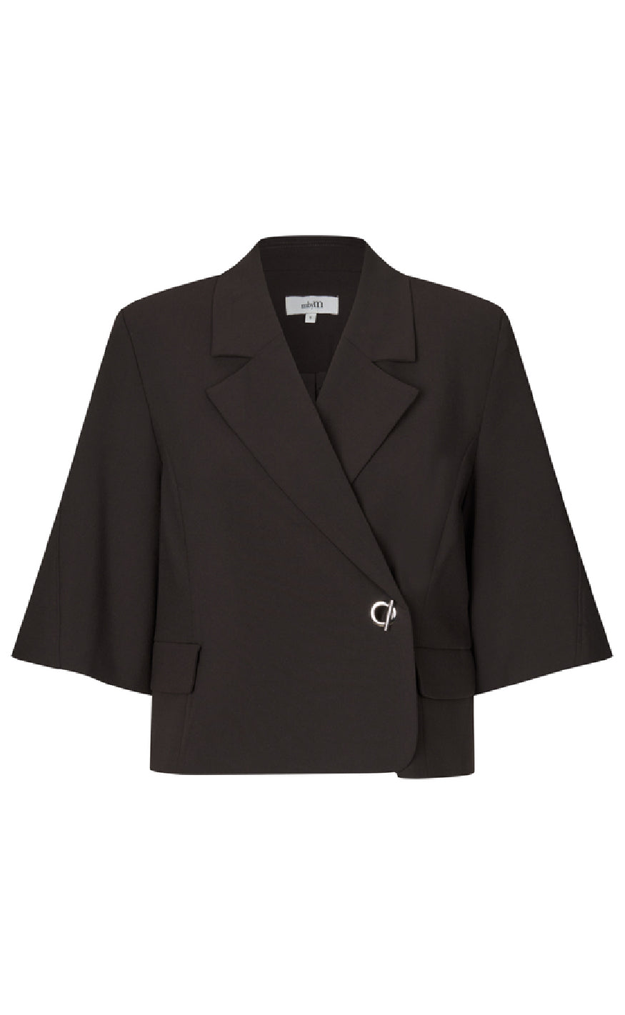 Elegant brun cropped blazer fra mbyM med bred revers, ¾-ærmer og asymmetrisk lukning med dekorativt metalspænde.