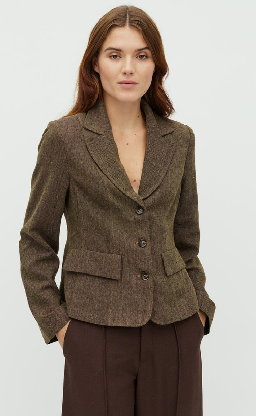 Stilren blazer fra MbyM i en dyb olivengrøn nuance med et klassisk og tidløst design.