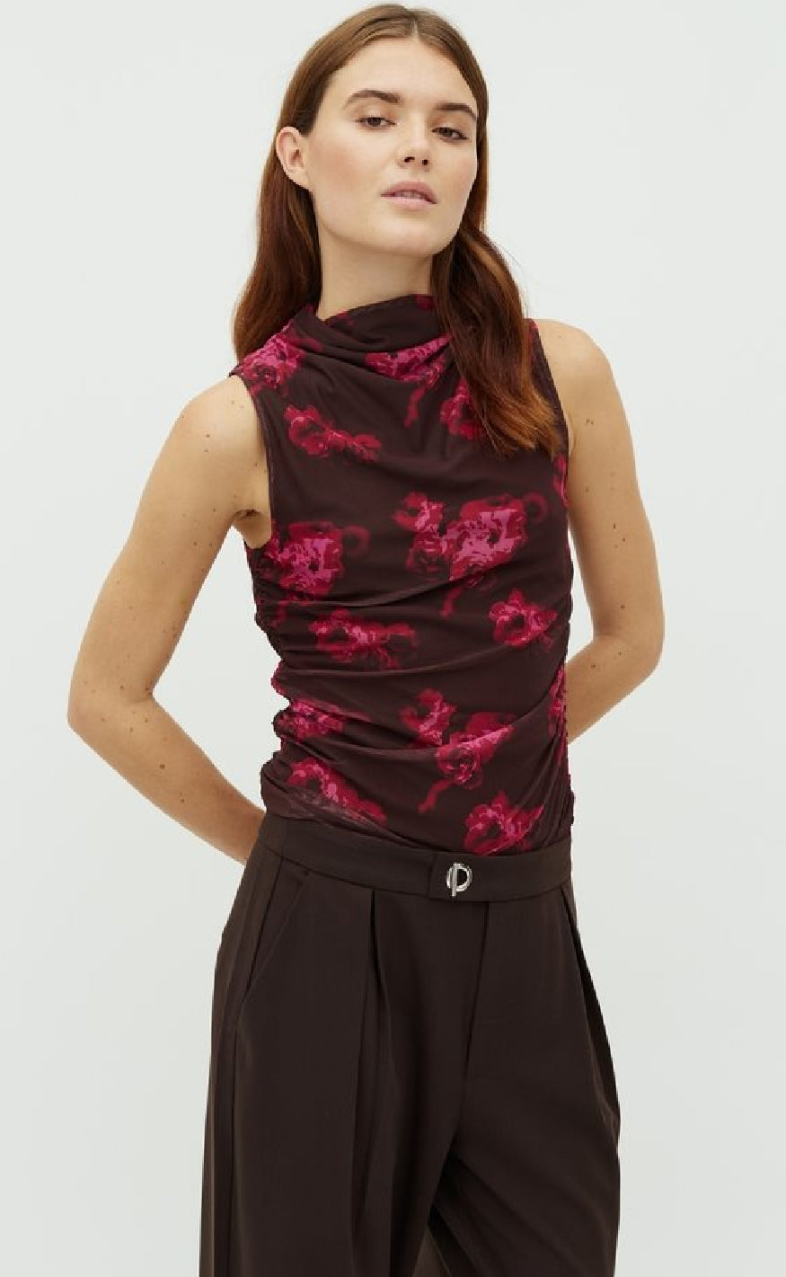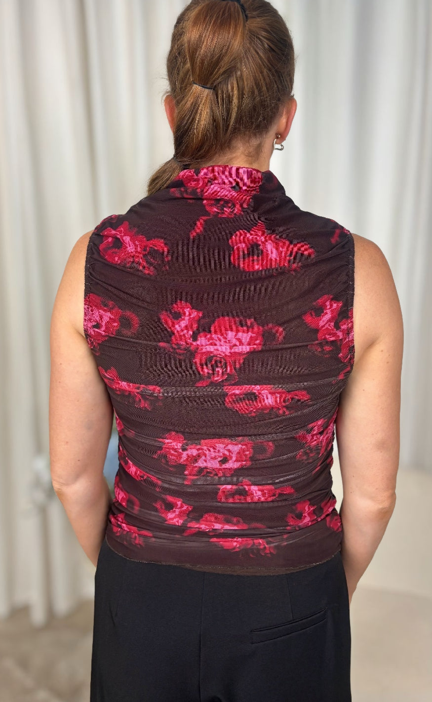 Elegant og flatterende mesh-top med mørk bund og smukke bordeaux blomstermotiver.