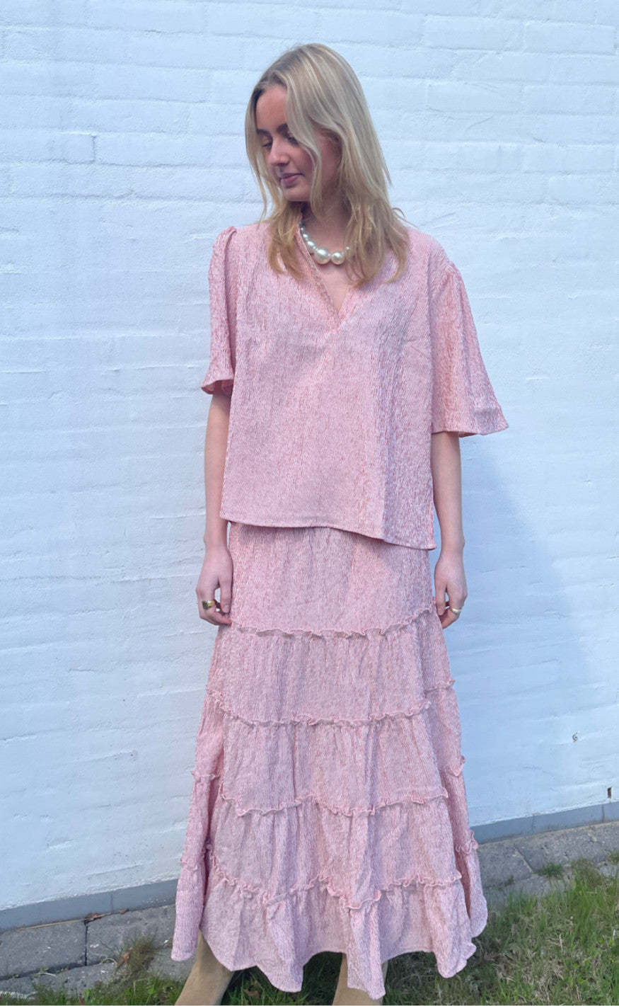 Nederdelen er lang med flæse detaljer.