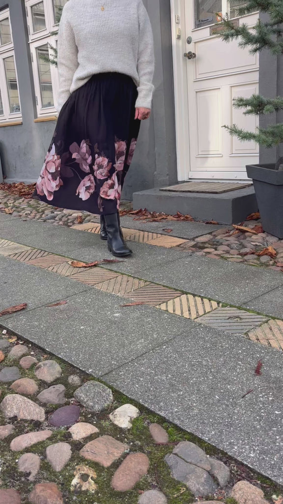 Smuk og eksklusiv nederdel fra Say INA Copenhagen i sort med blomster i bunden af nederdelen.