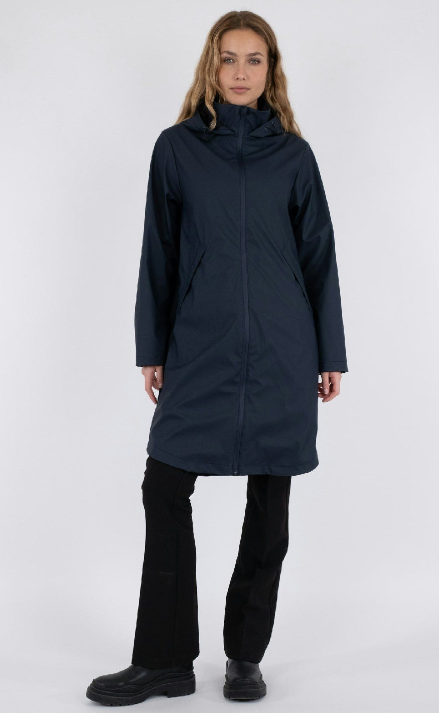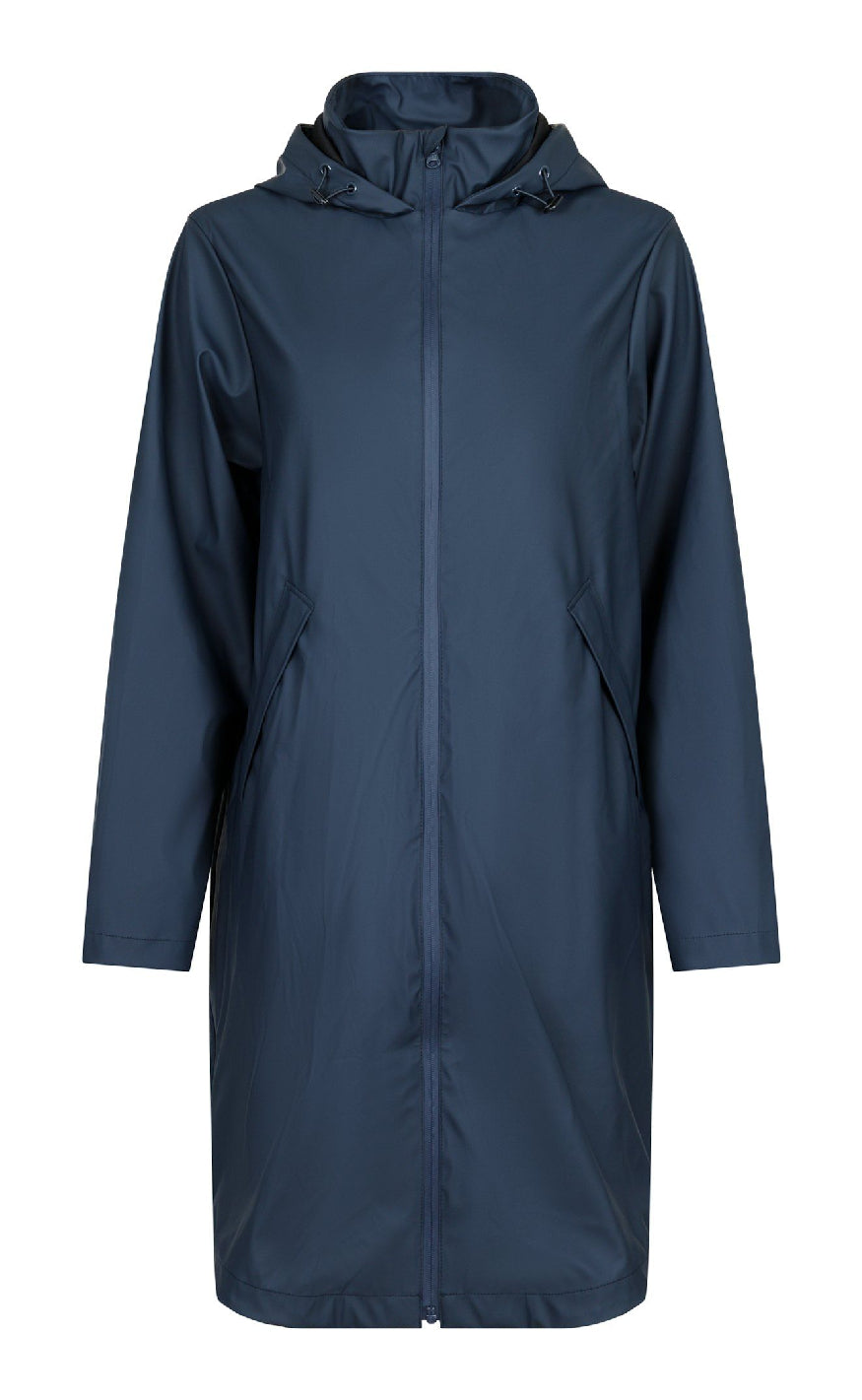 Jakken er knælang og har en funktionel lynlås i siden,som gør den perfekt til at cykle