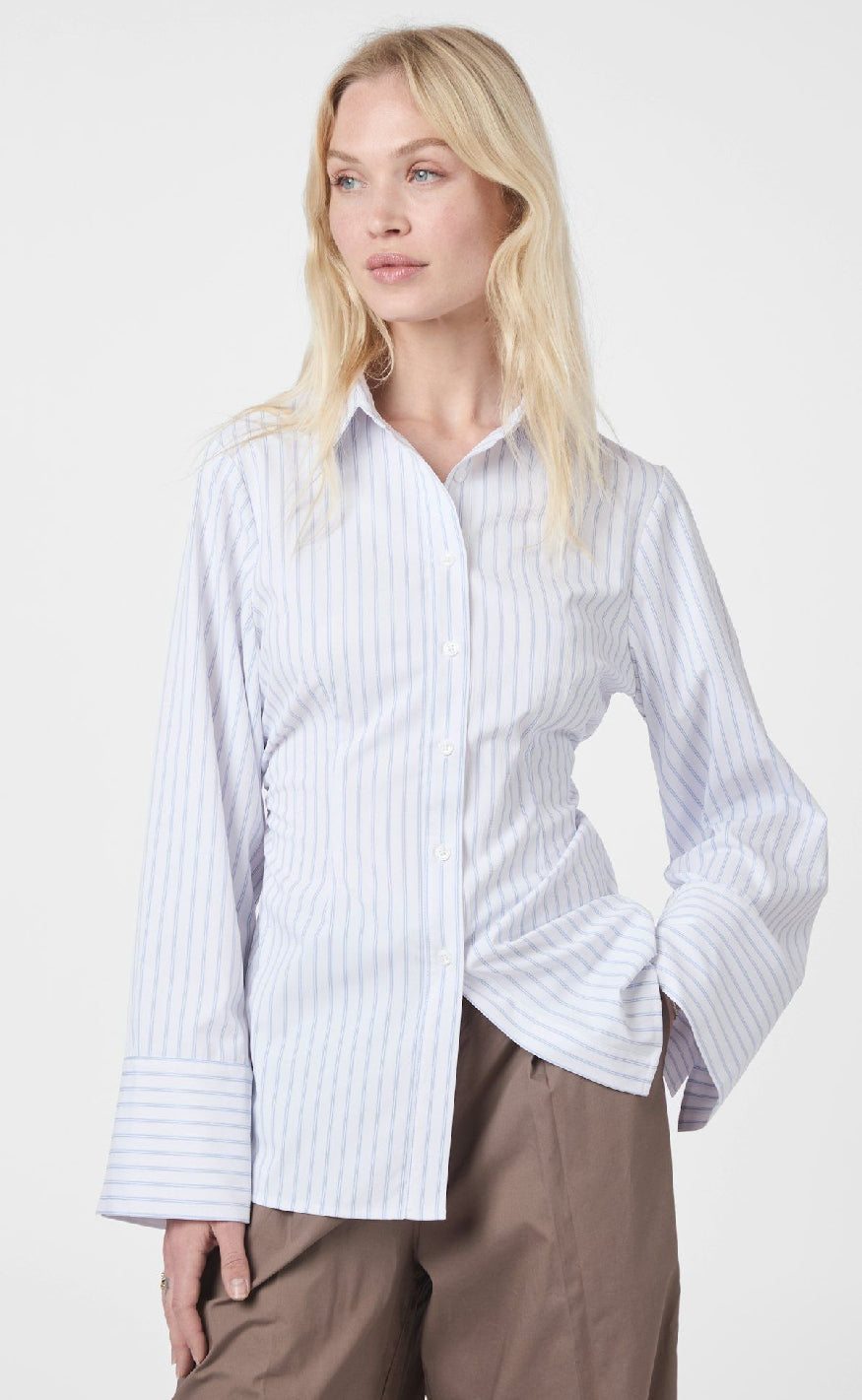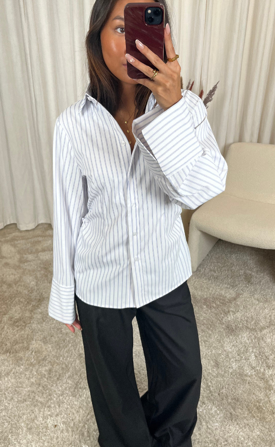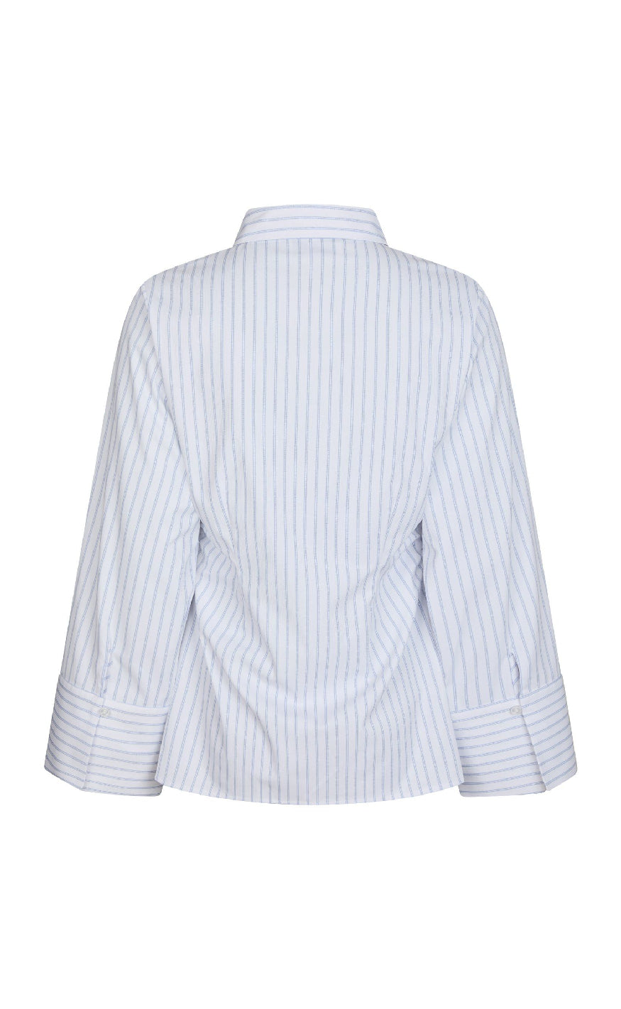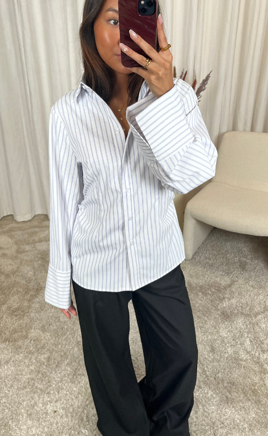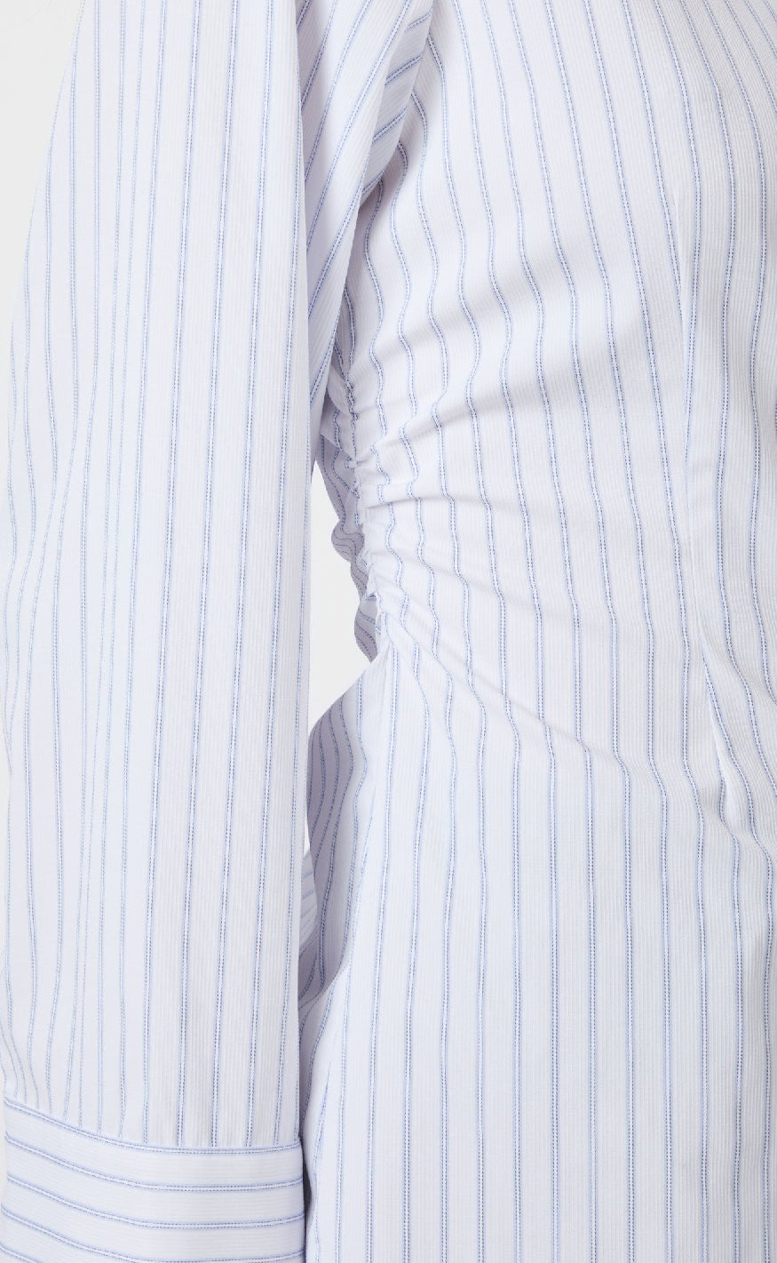 Skjorten har en rynke detalje i siden og har lange ærmer.