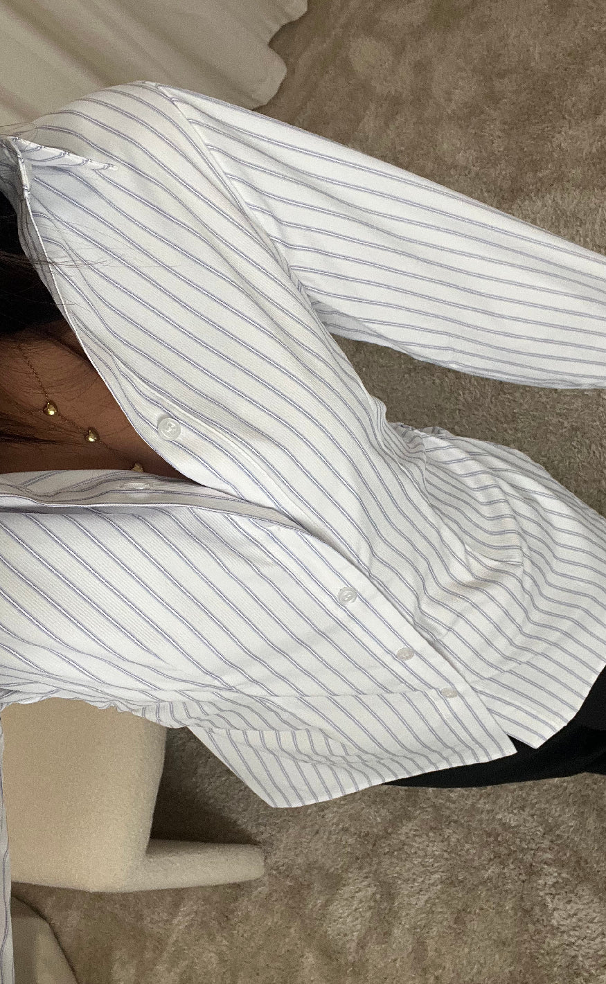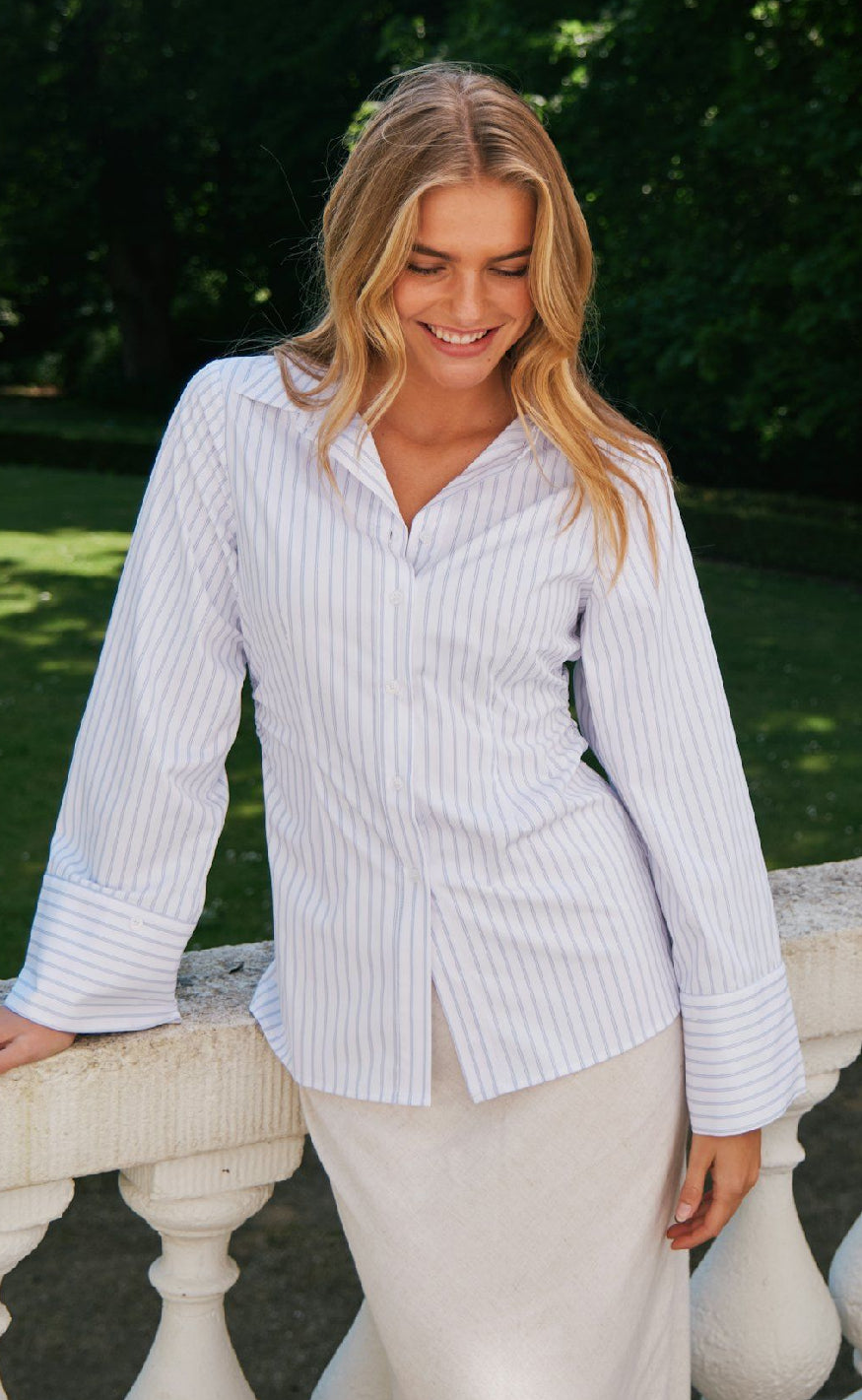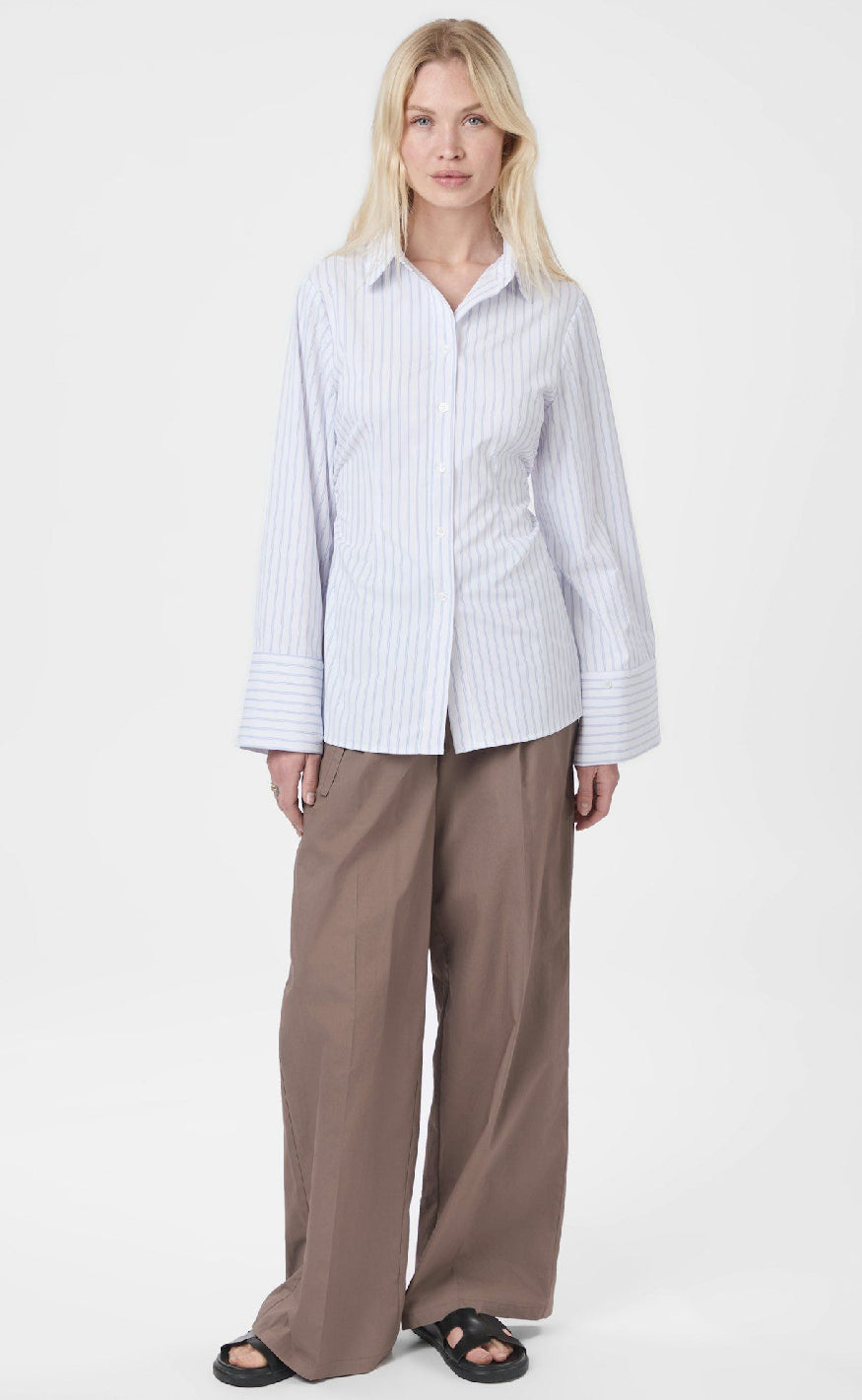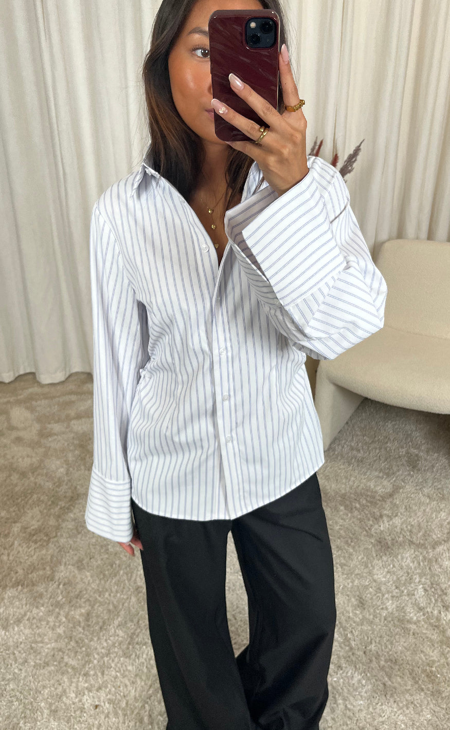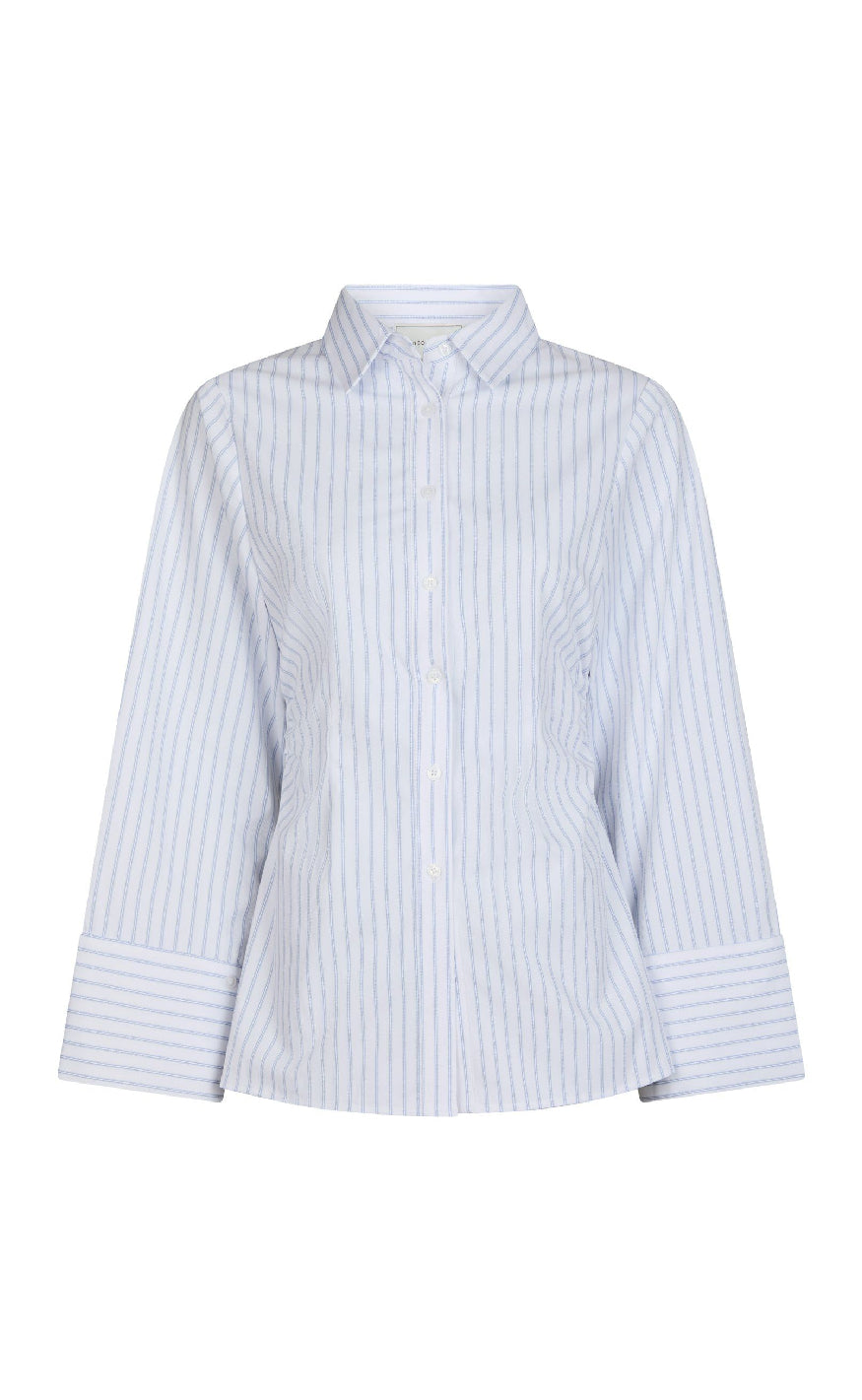 Skjorten har en rynke detalje i siden og har lange ærmer.