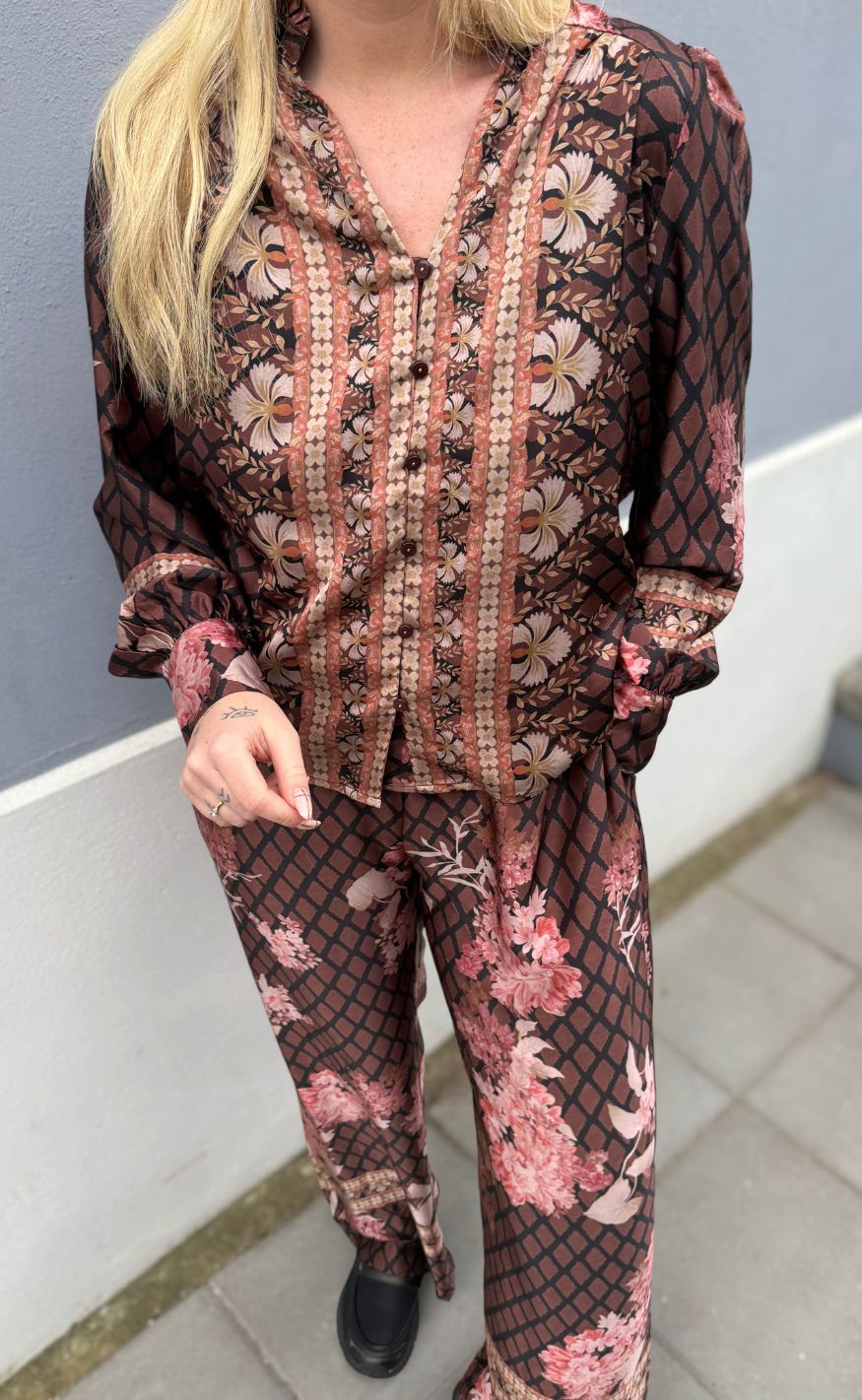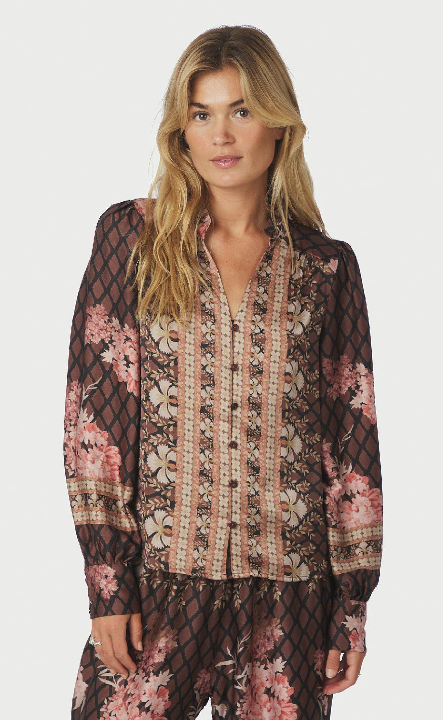 Blusen har lange ærmer og har en v-hals med dekorative knapper.