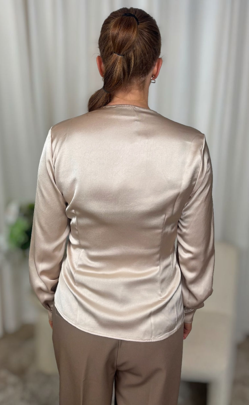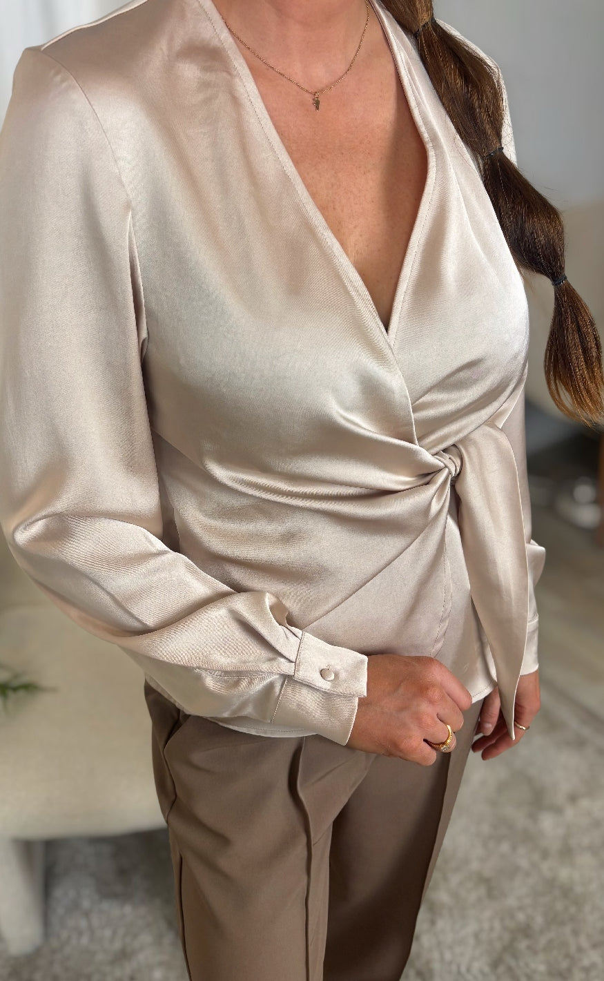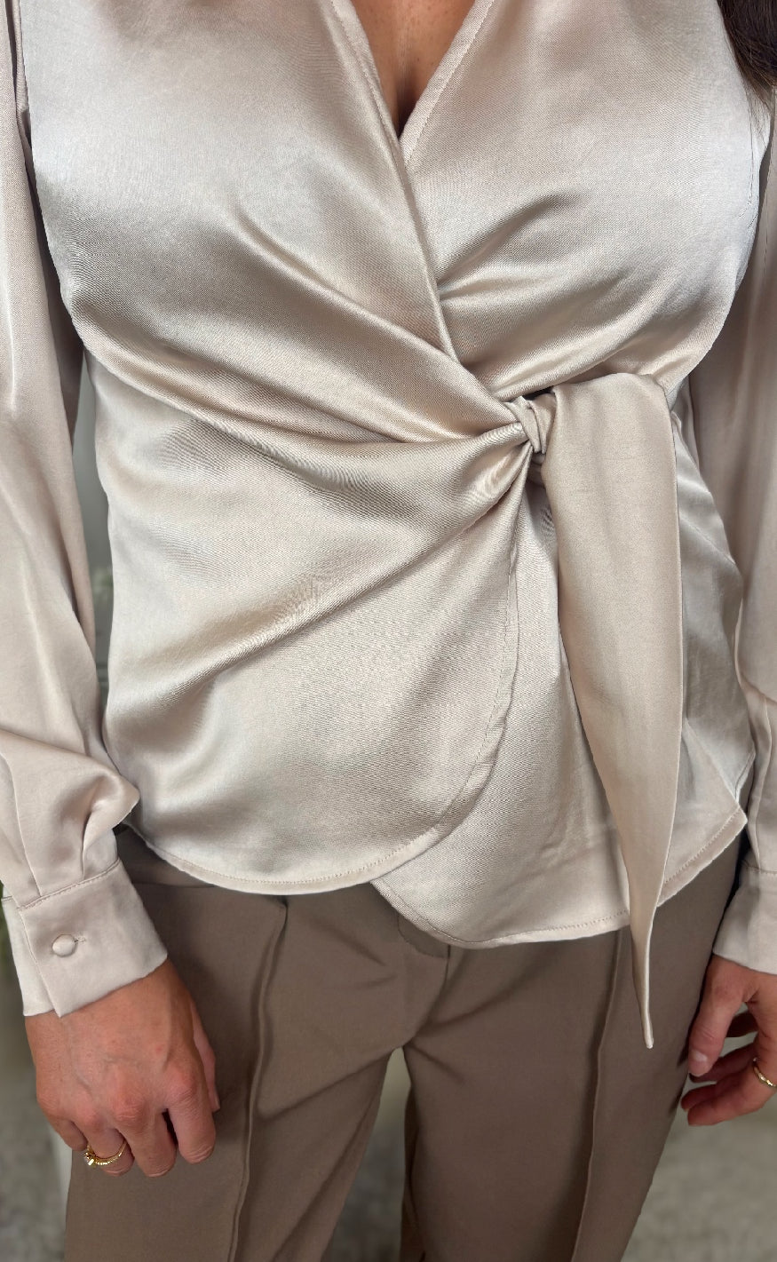 Elegant satinbluse fra Neo Noir med slå-om design og knudedetalje i taljen – et stilfuldt valg til både hverdag og fest.
