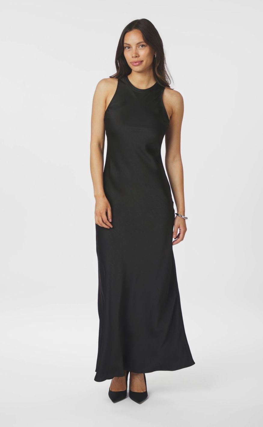 Lang, sort kjole i enkelt og elegant design.