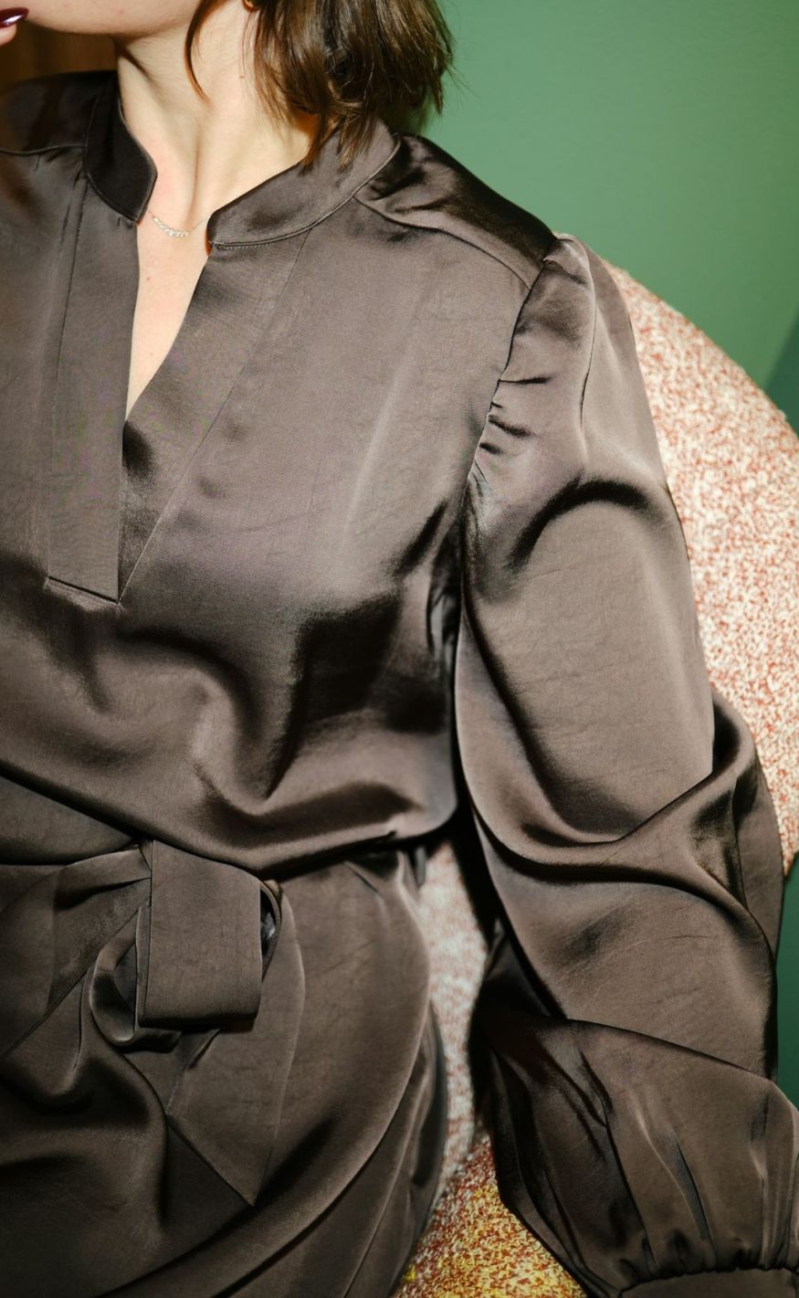 Designet har V-udskæring, lange ærmer med elastik og bindebånd i taljen, der giver en feminin silhuet.
