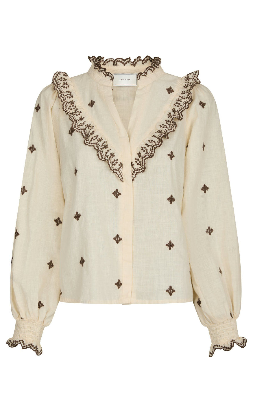 Gul bluse fra Neo Noir med broderede detaljer og romantiske flæser langs halsudskæringen.