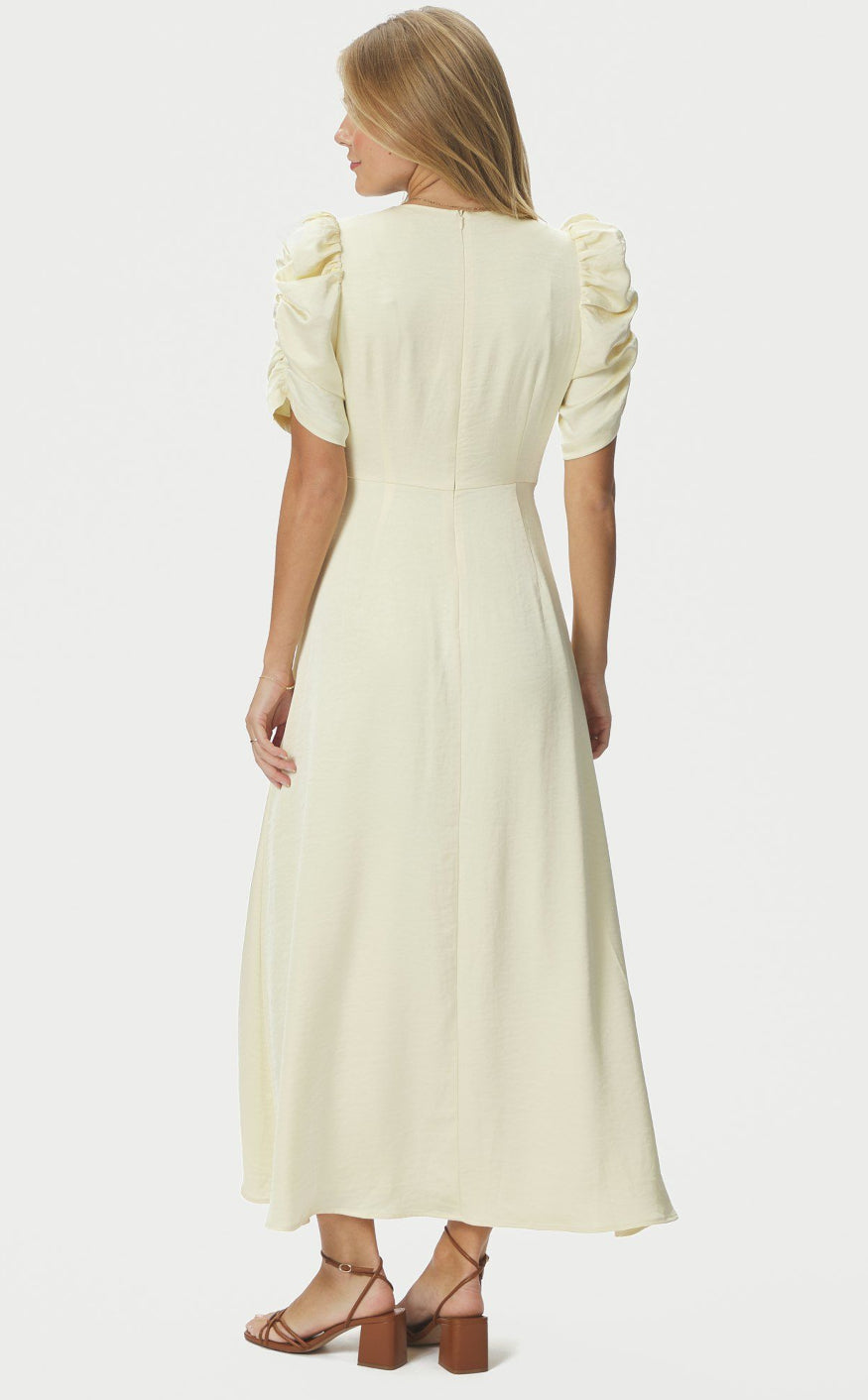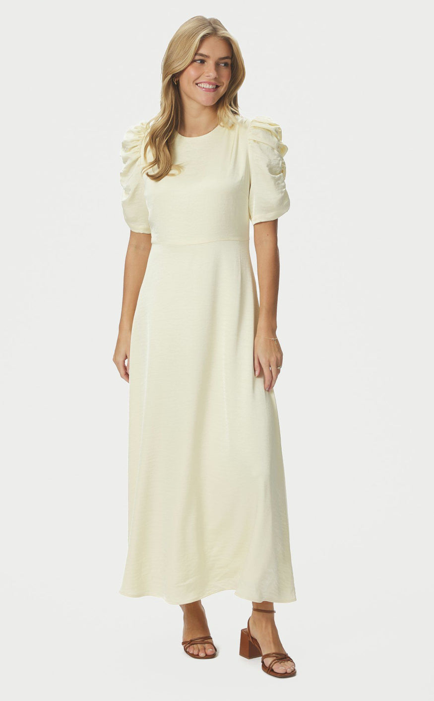Kjolen har korte puffærmer, rund hals og et langt, let A‑formet skørt, som giver et feminint og tidløst udtryk.