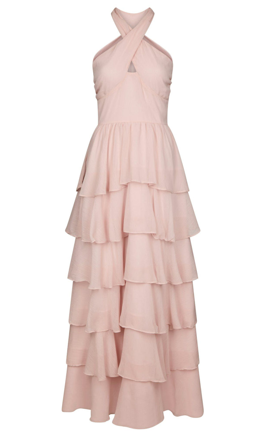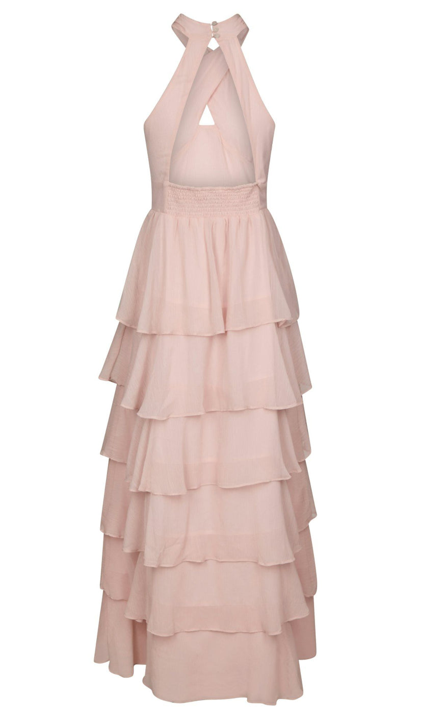 Kjolen har halterneck‑udskæring med smukt kryds foran og et langt, voluminøst skørt med flere etager, som giver et romantisk og festligt udtryk.