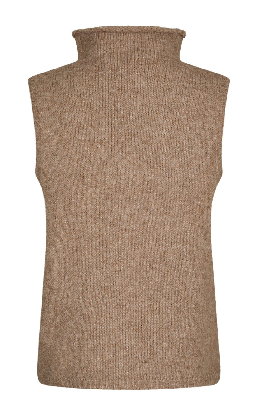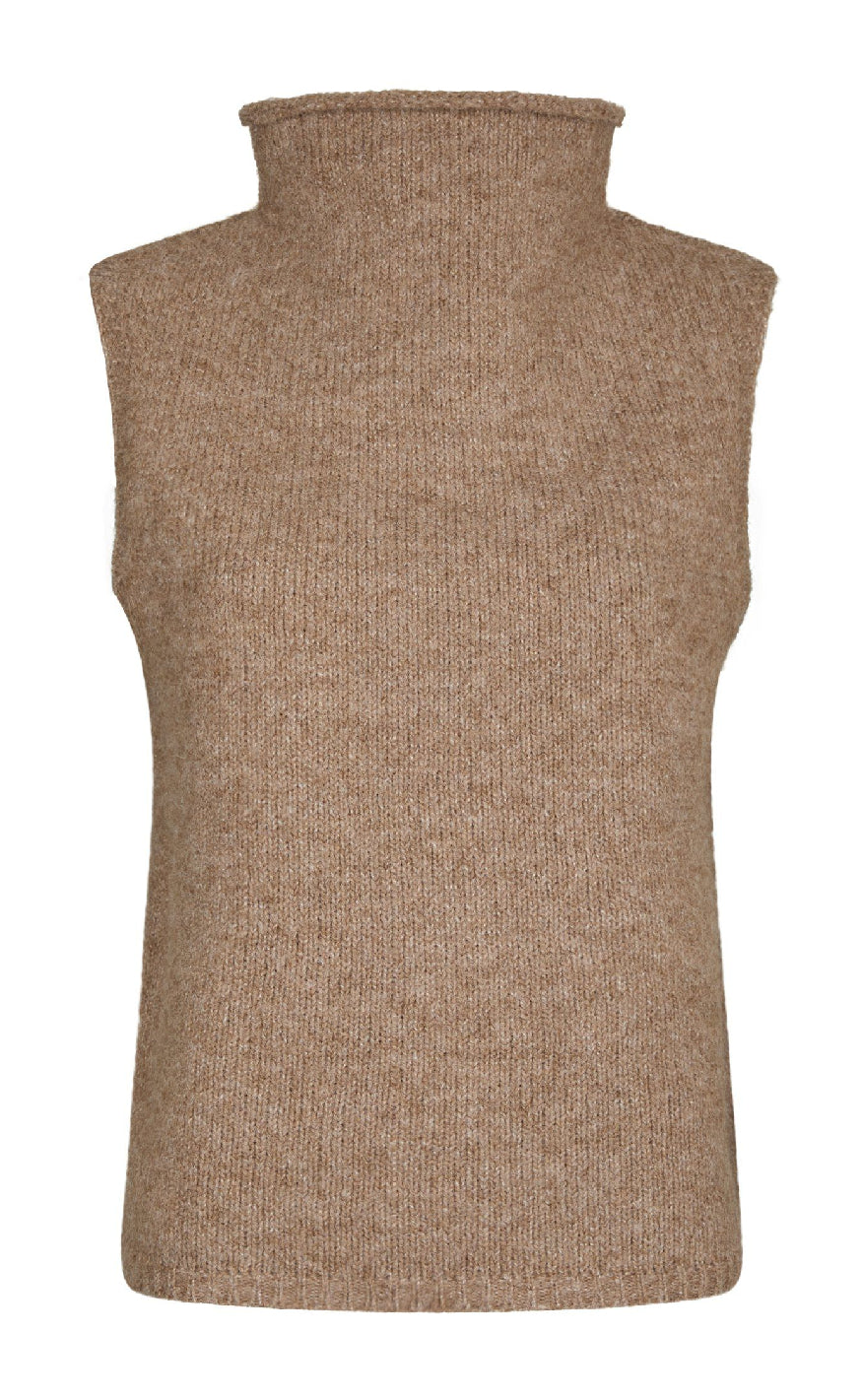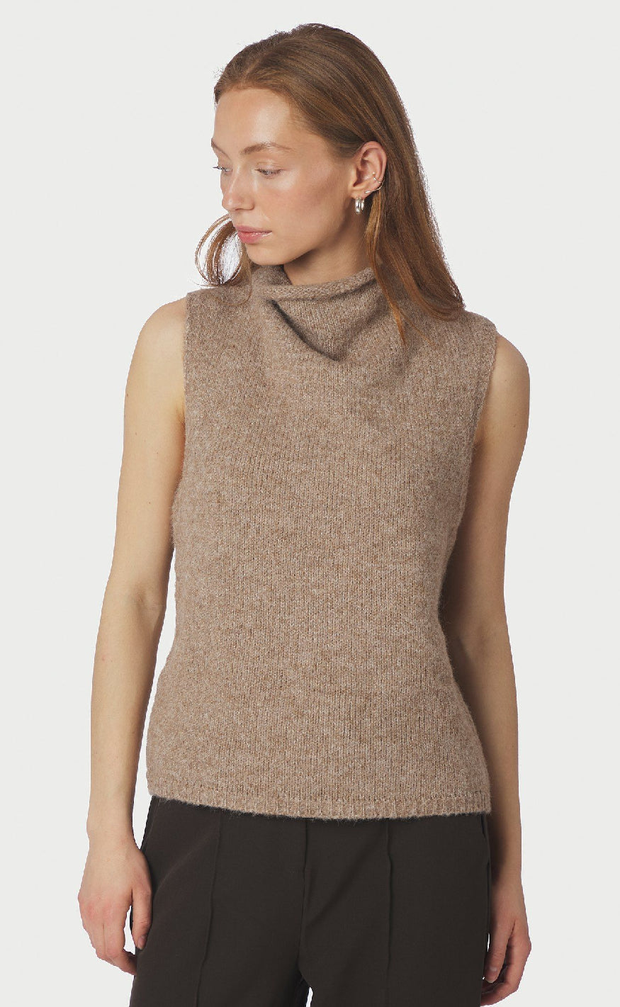 Sandfarvet strik top fra Neo Noir i en blød kvalitet med høj hals og ærmeløst design.