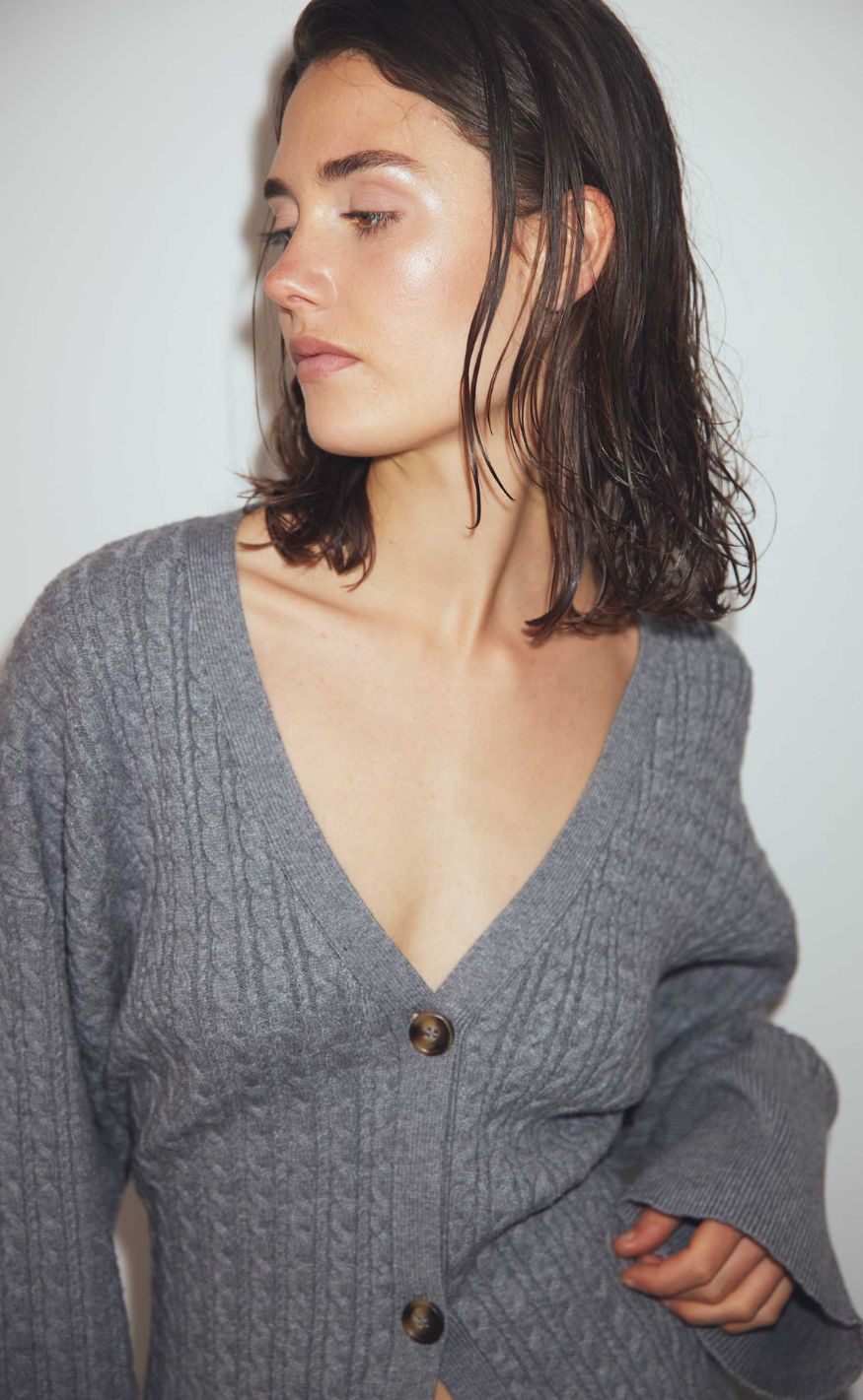 Kort og figursyet cardigan i grå med fine kabeldetaljer og voluminøse, lige ærmer.