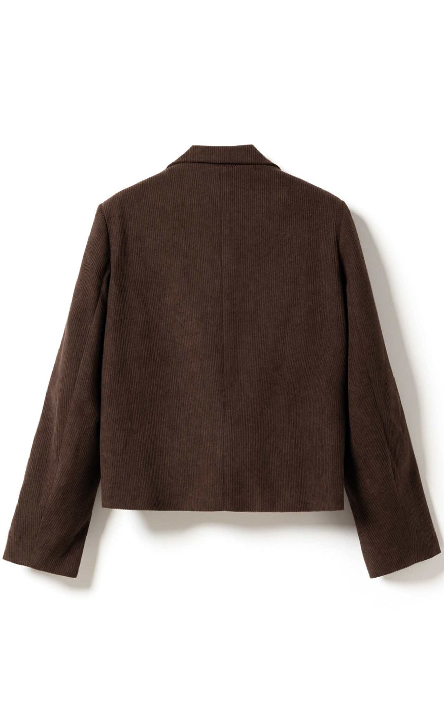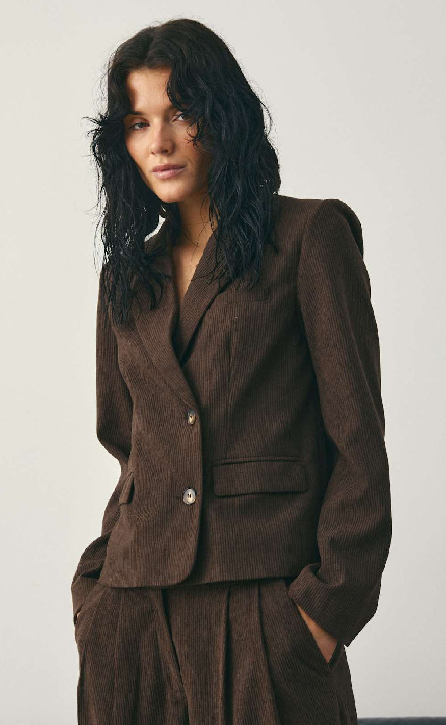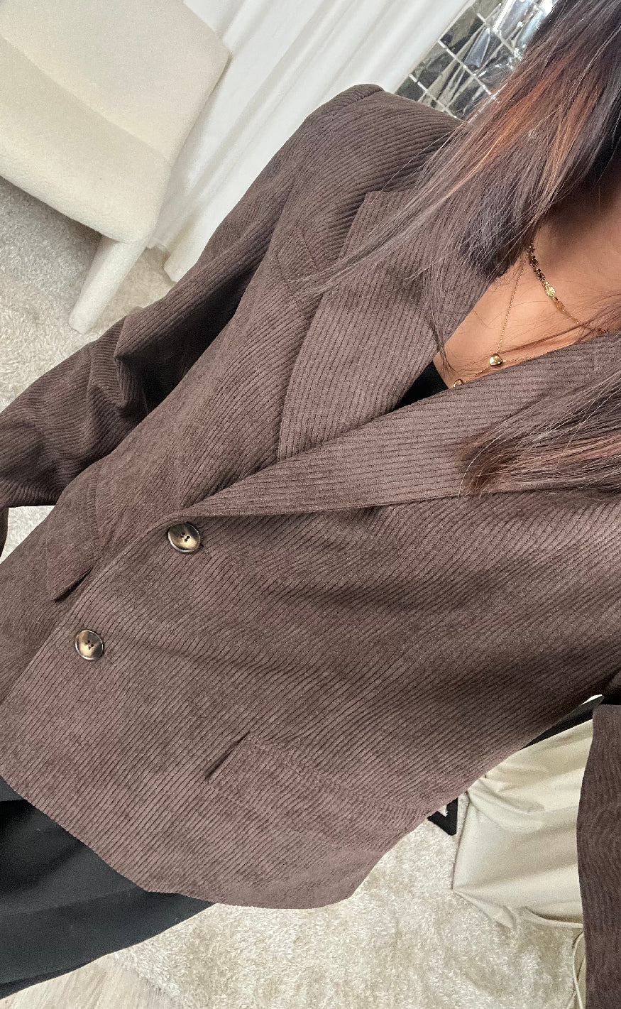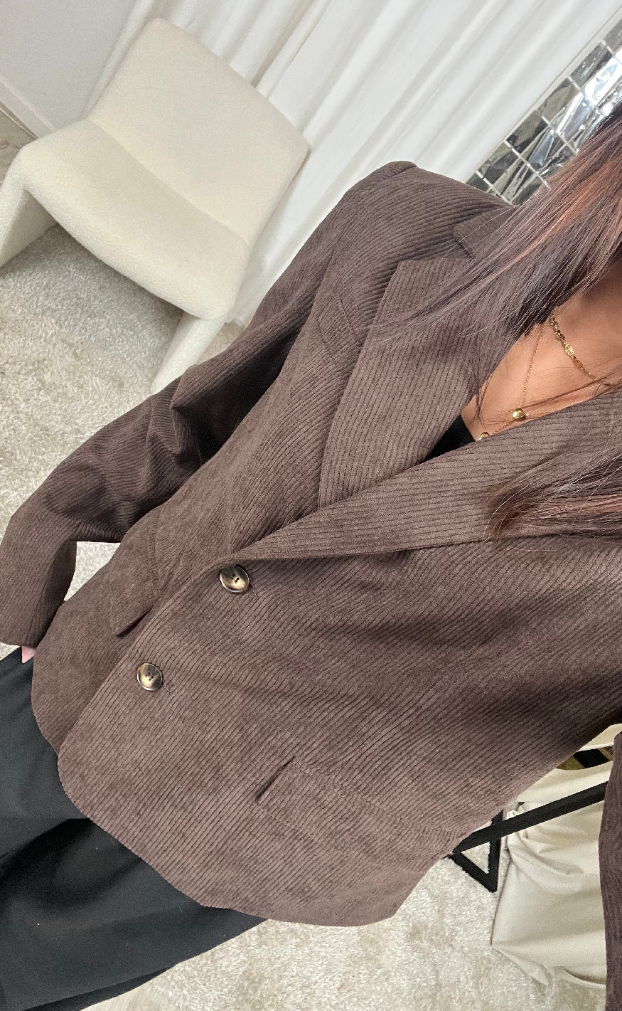 Blazer i mørkebrun fløjl med klassisk revers, knaplukning foran og strukturerede skuldre, der giver et sofistikeret og tidløst look.